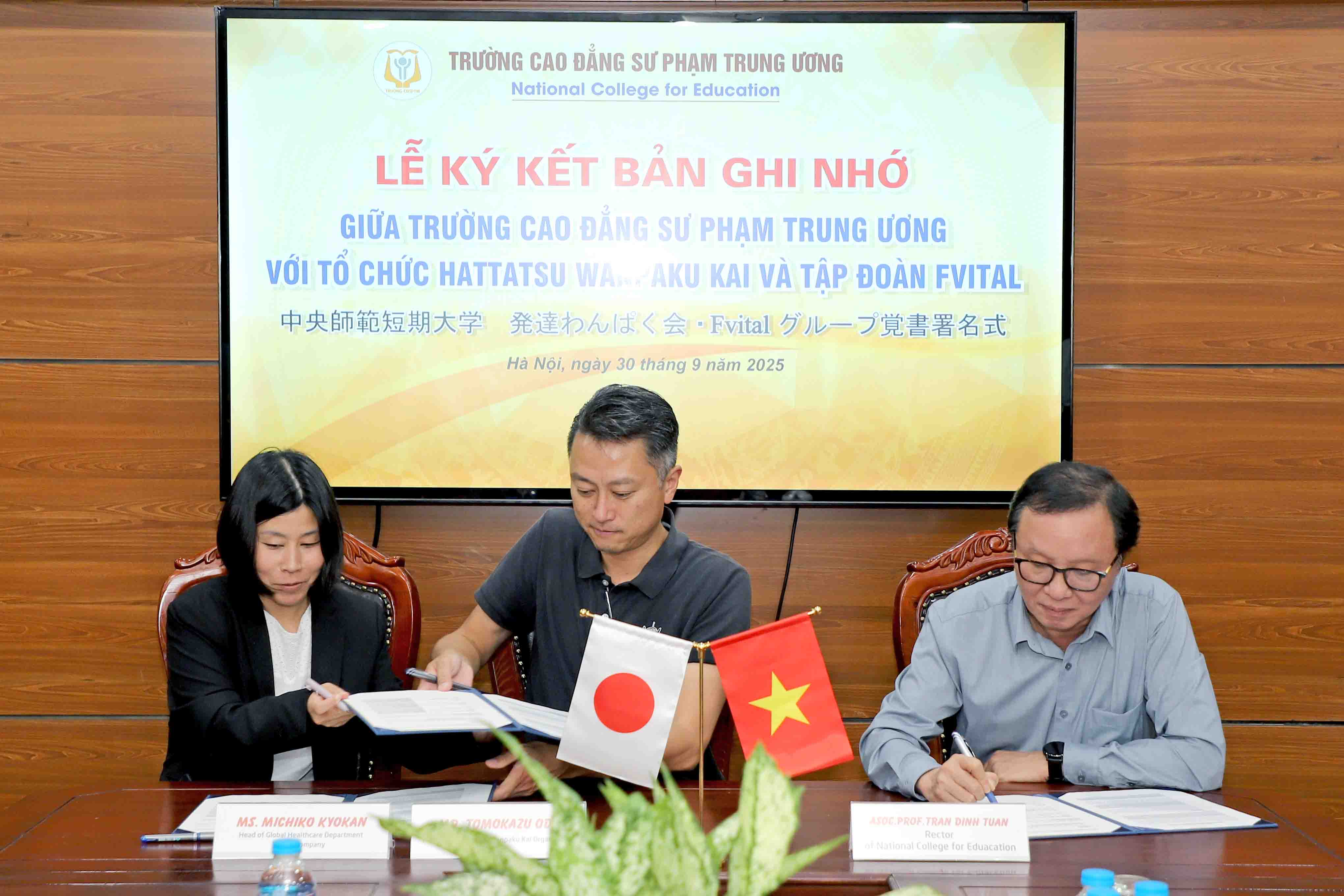 NCE Sáng ngày 30/9/2025, tại Trường Cao đẳng Sư phạm Trung ương (CĐSPTW), Nhà trường tổ chức Lễ ký kết Biên bản ghi nhớ hợp tác với Tổ chức Hattatsu Wanpaku Kai (Nhật Bản) và Công ty Fvital. Sự kiện mở ra cơ hội tăng cường hợp tác trong lĩnh vực giáo dục hòa nhập, đặc biệt là chăm sóc, giáo dục trẻ tự kỷ và trẻ khuyết tật.