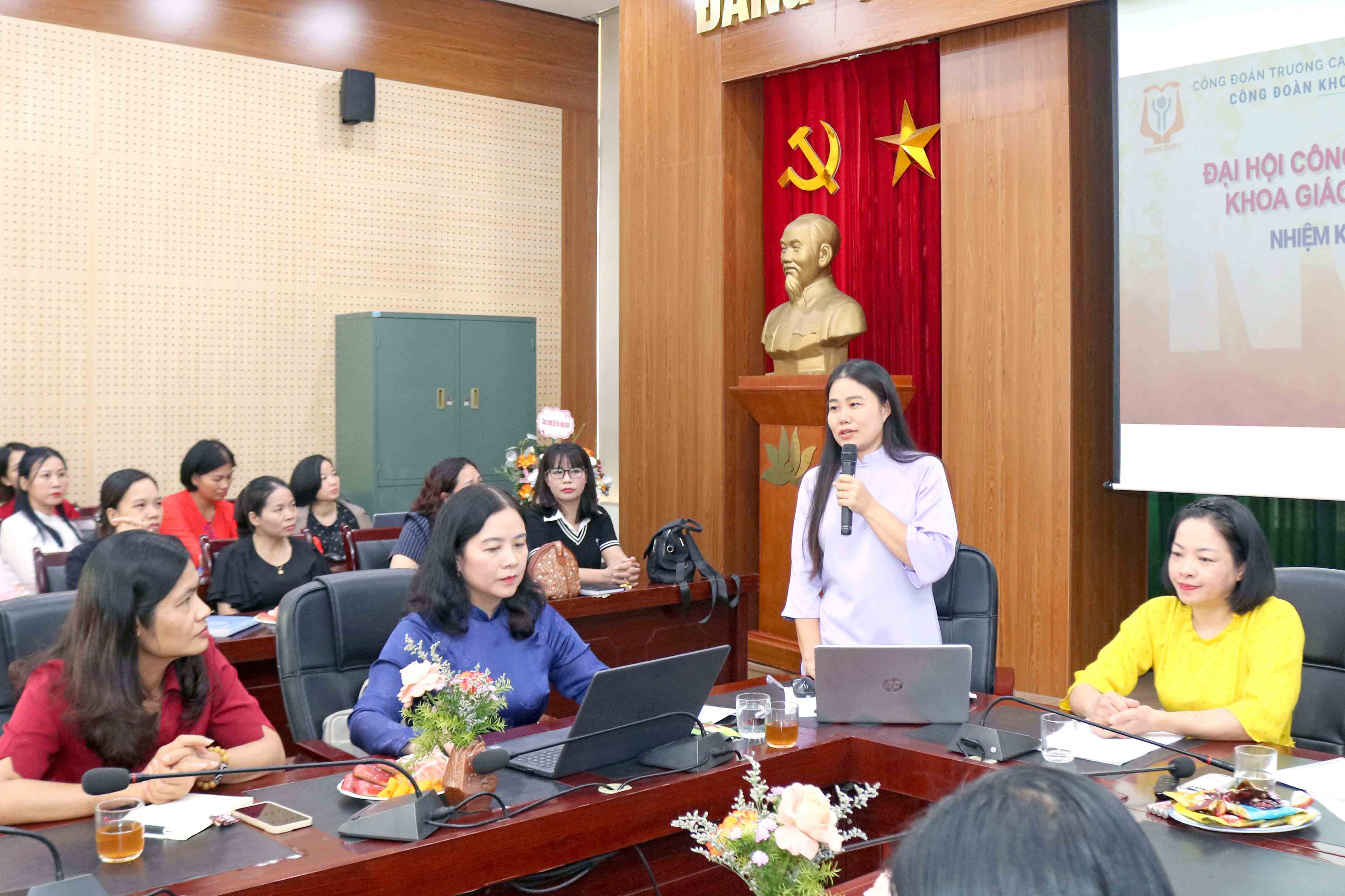 Đại hội cũng đã được nghe các tham luận về những vấn đề thiết thực như: Công tác chăm lo đời sống của cho công đoàn viên (Ths Hoàng Thị Thương Huyền, Ủy viên BCH Công đoàn Khoa, giảng viên Tổ Giáo dục Thể chất); Công đoàn viên với công tác nghiên cứu khoa học (Th.S Phạm Thùy Linh, giảng viên Tổ Tâm lý).