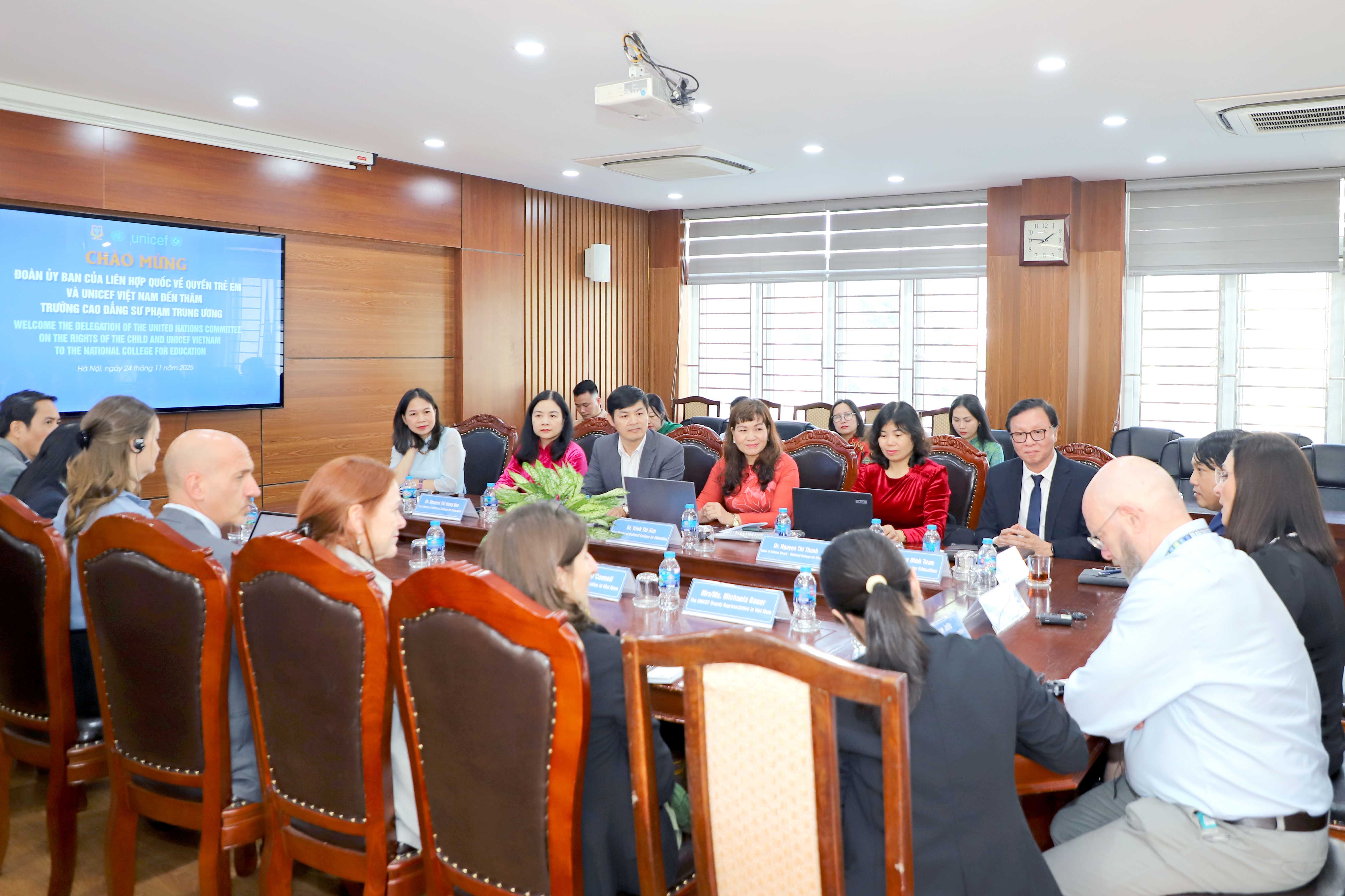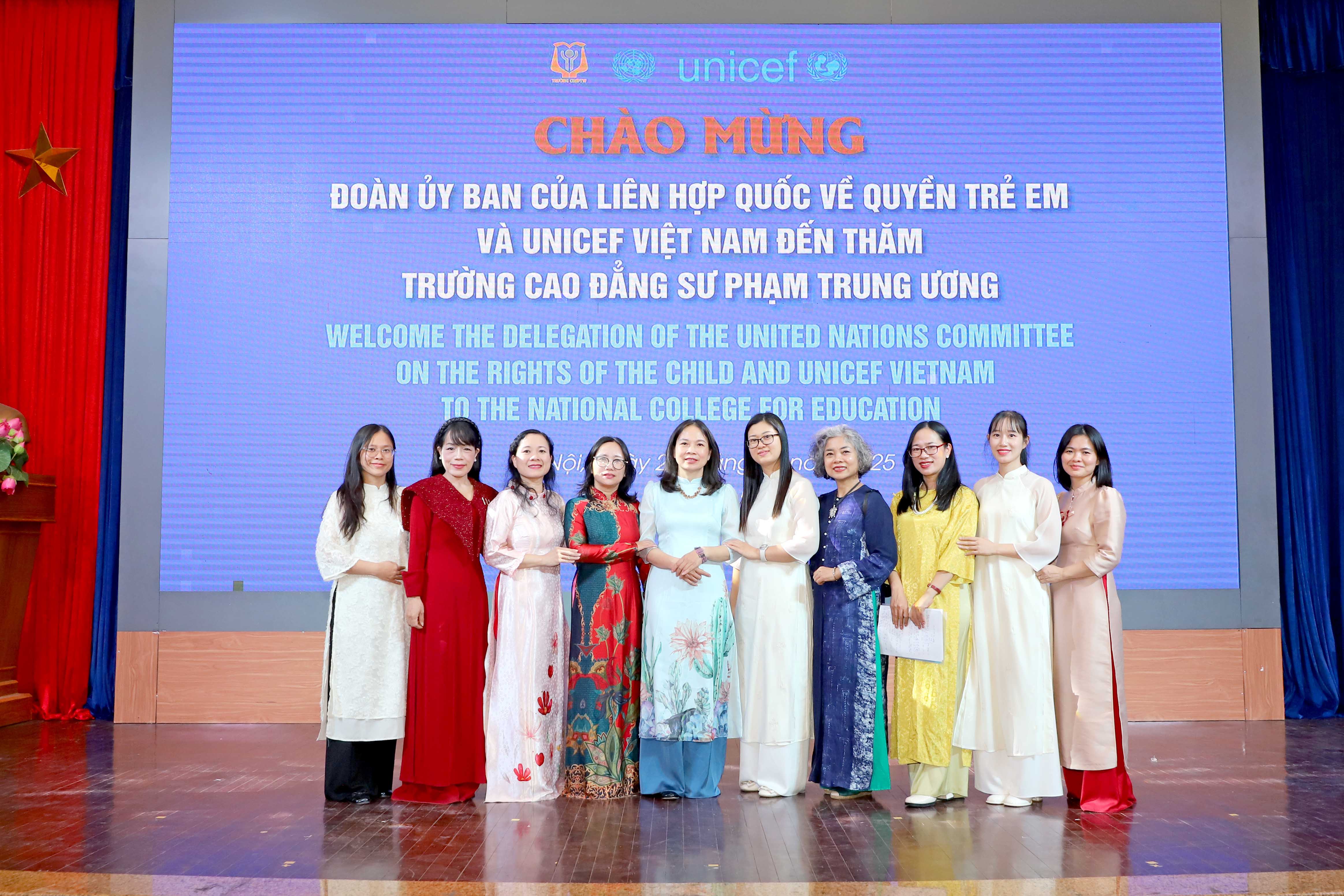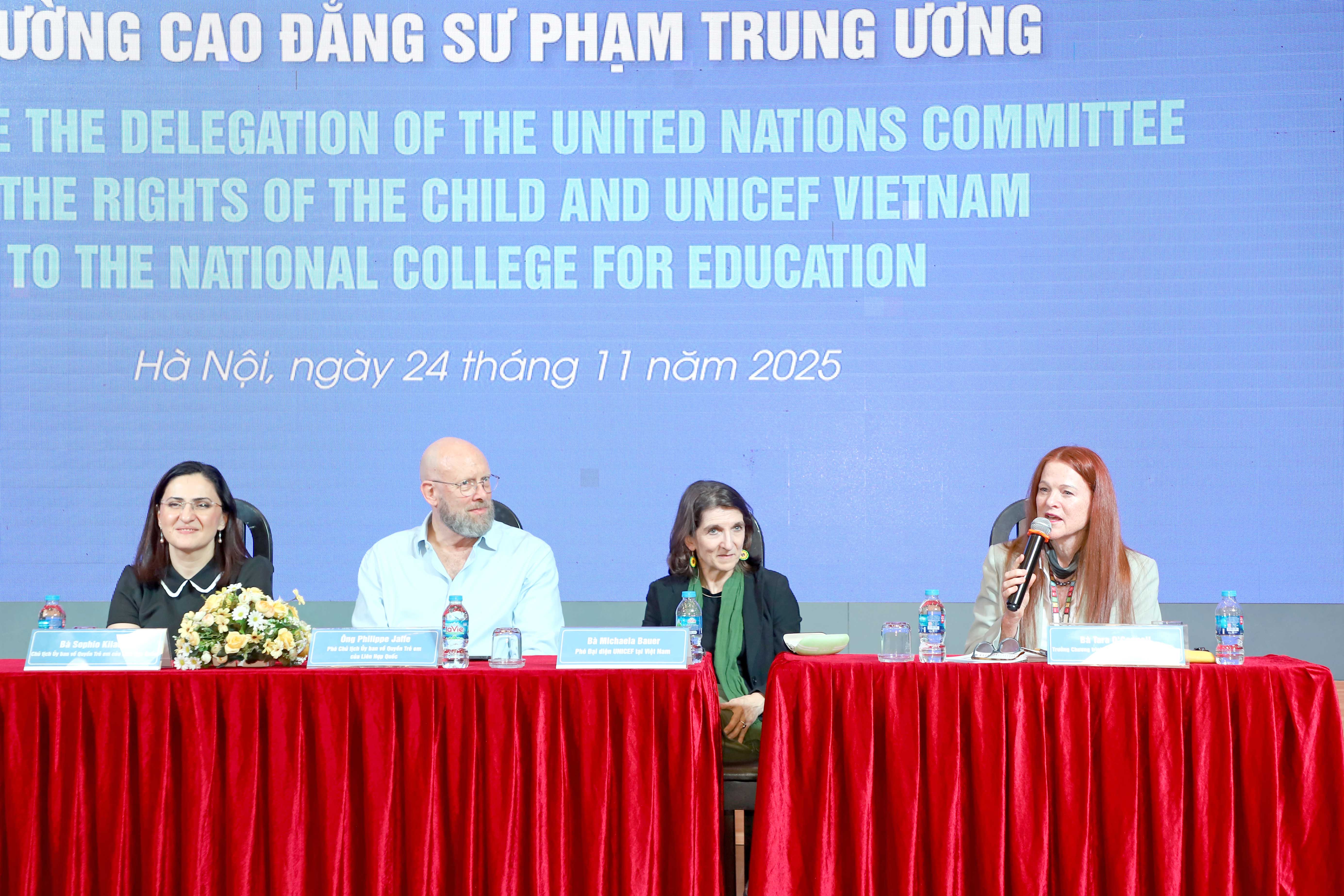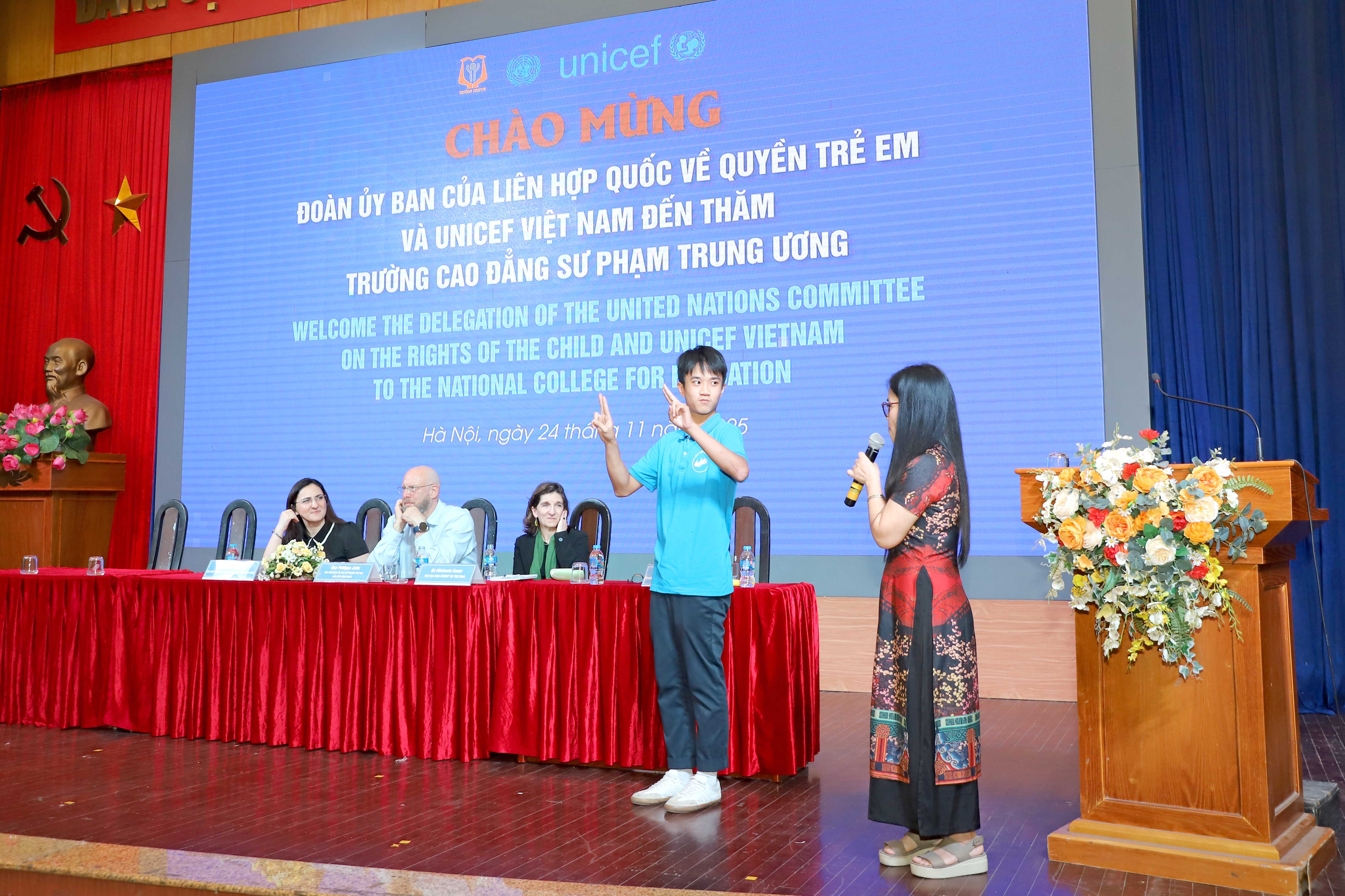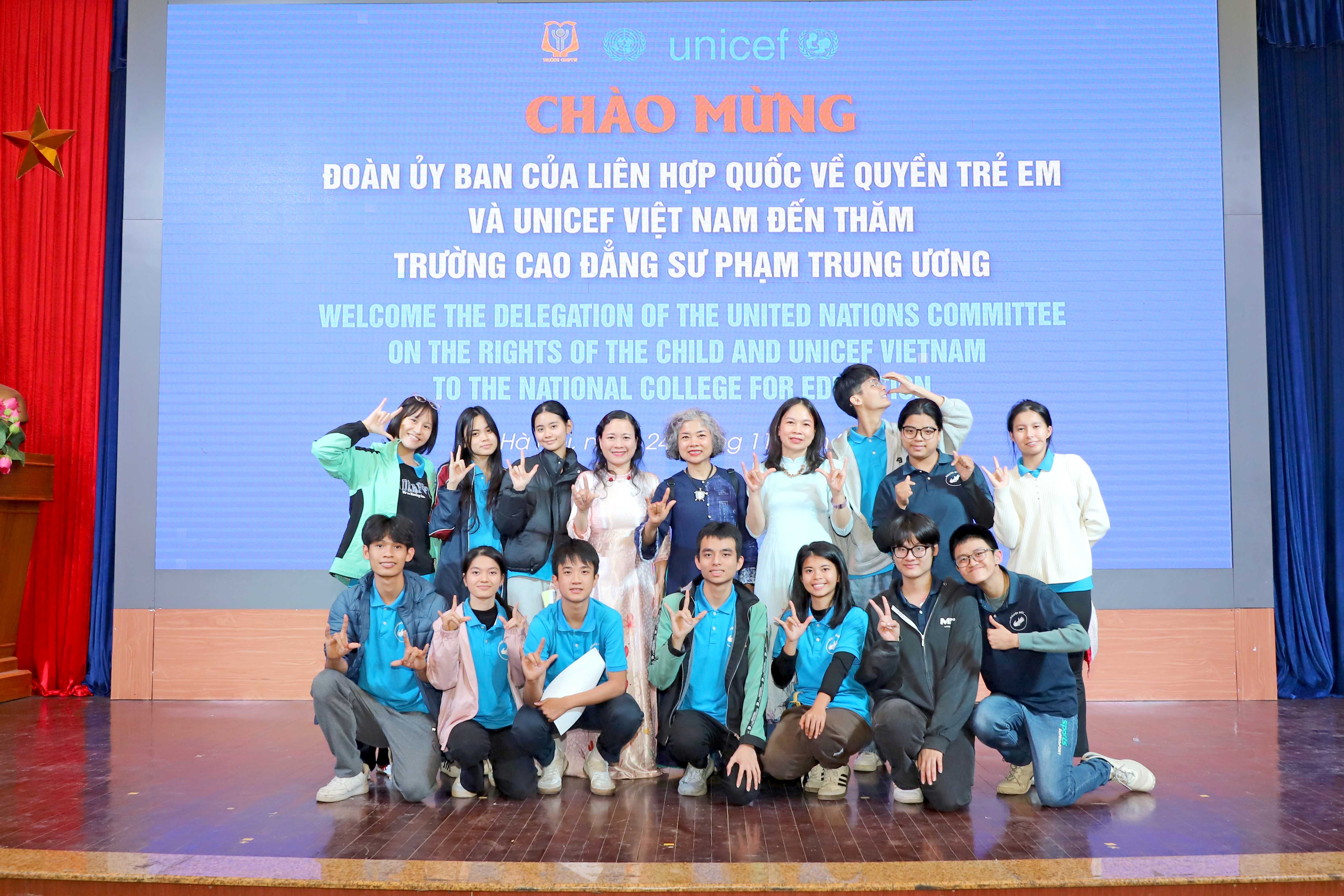 NCE Chiều ngày 24/11/2025, Đoàn Ủy ban của Liên Hợp Quốc về Quyền Trẻ em và đại diện UNICEF Việt Nam đã tham quan làm việc tại Trường Cao đẳng Sư phạm Trung ương (CĐSPTW). Trong khuôn khổ chuyến thăm, đoàn đã tới Trung tâm Hỗ trợ phát triển Giáo dục hòa nhập (HTPTGDHN) của Nhà trường. Tại đây, đoàn đã trực tiếp quan sát các hoạt động: trị liệu âm nhạc, can thiệp sớm, lớp học hòa nhập và mô hình giáo dục dành cho học sinh khiếm thính.