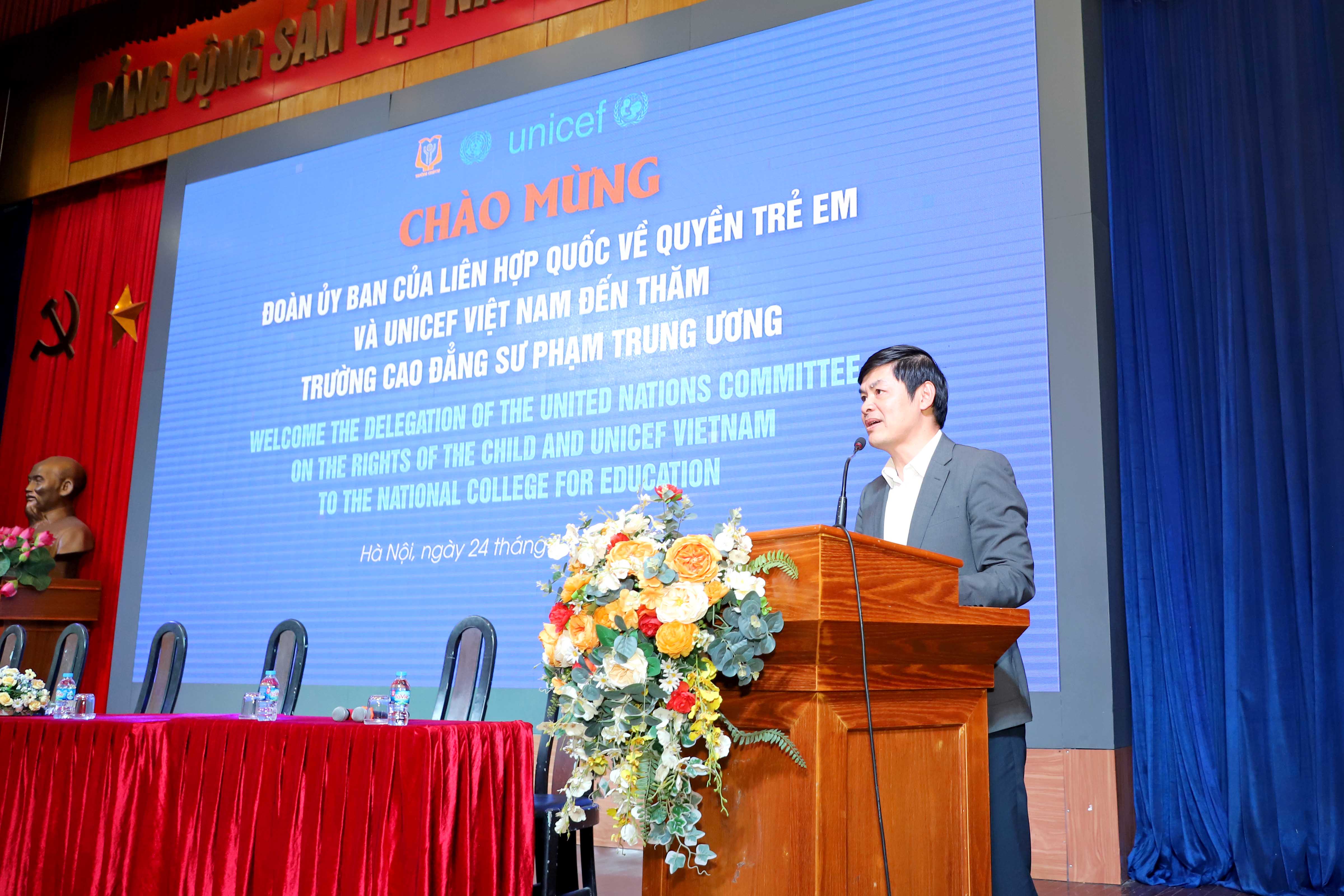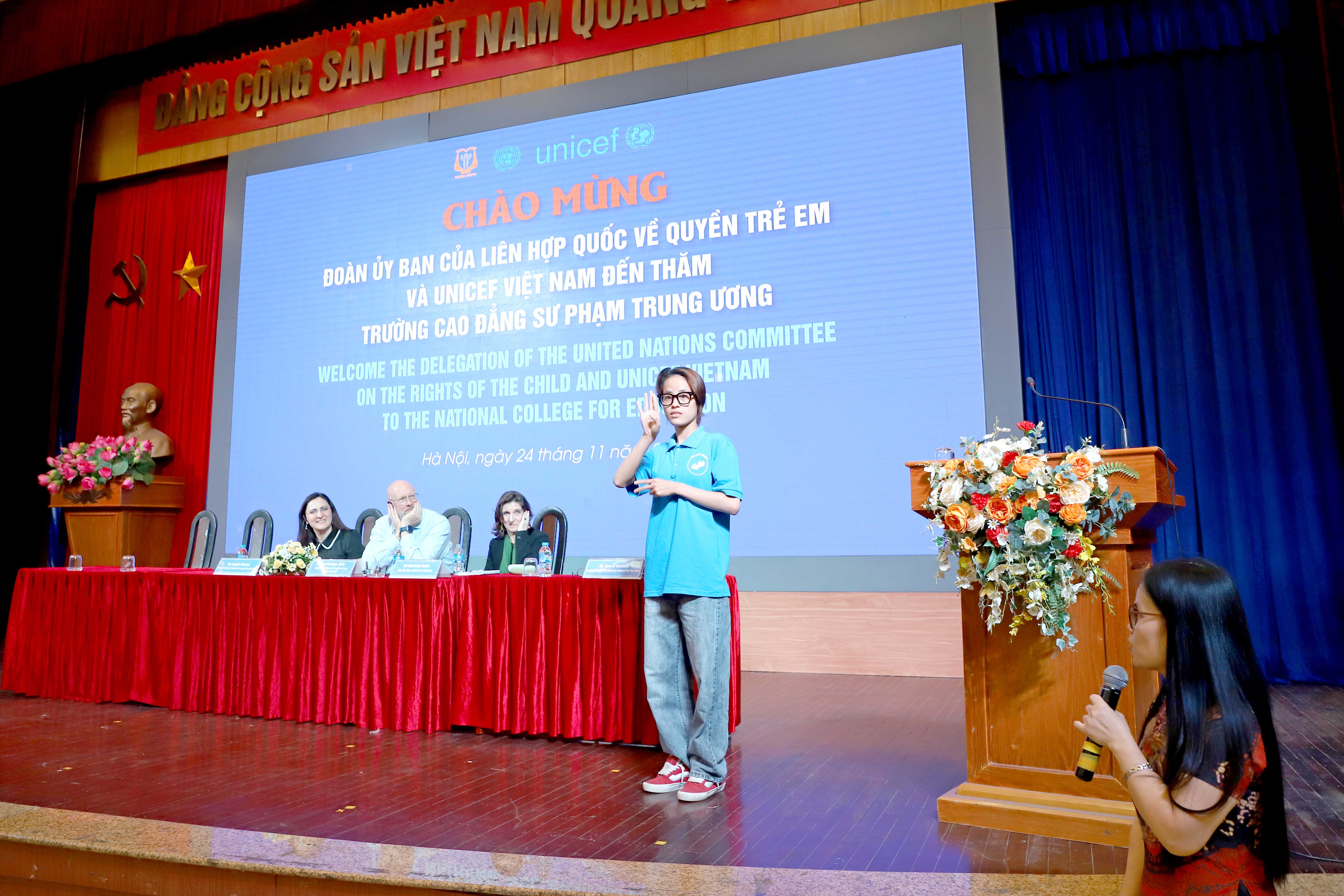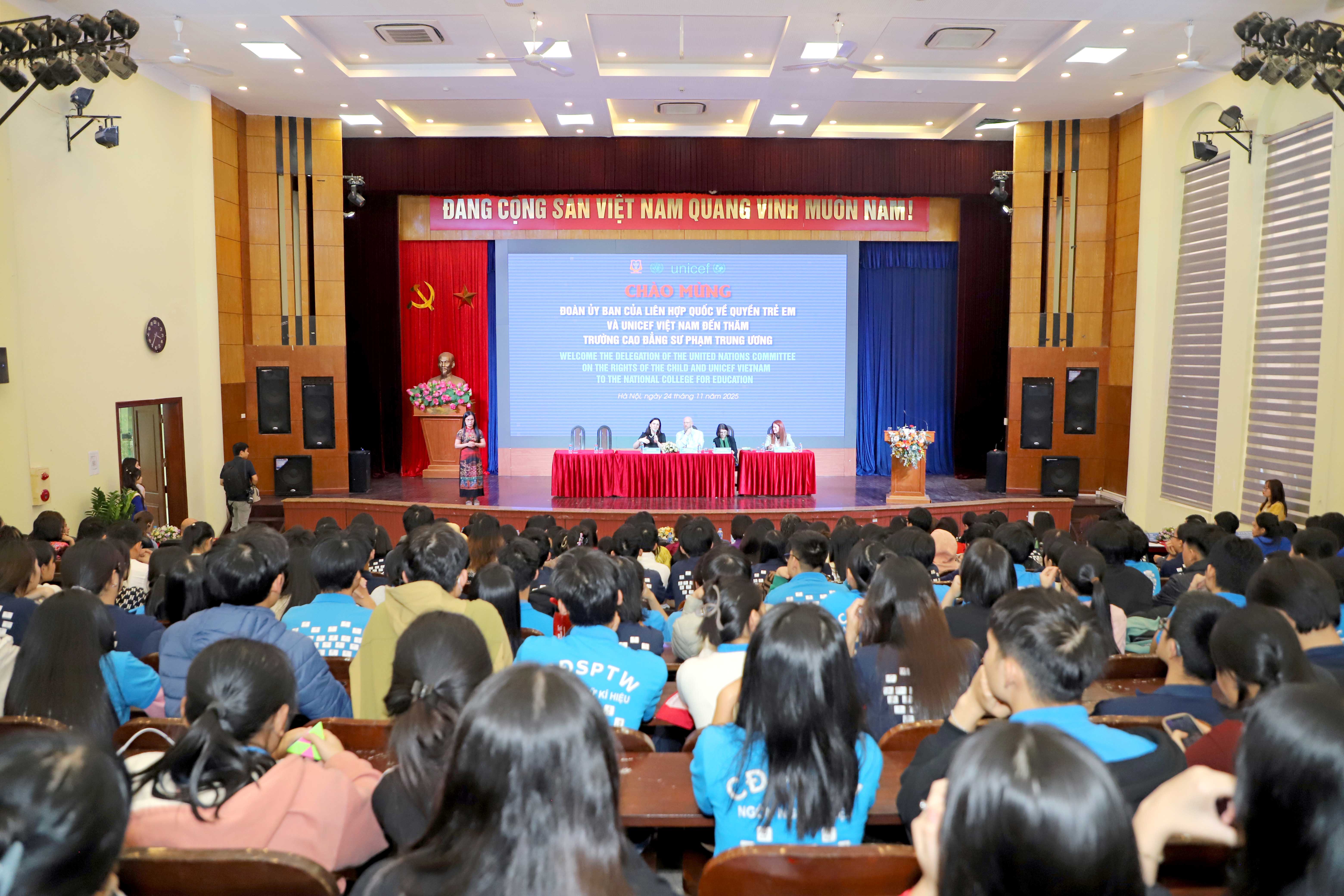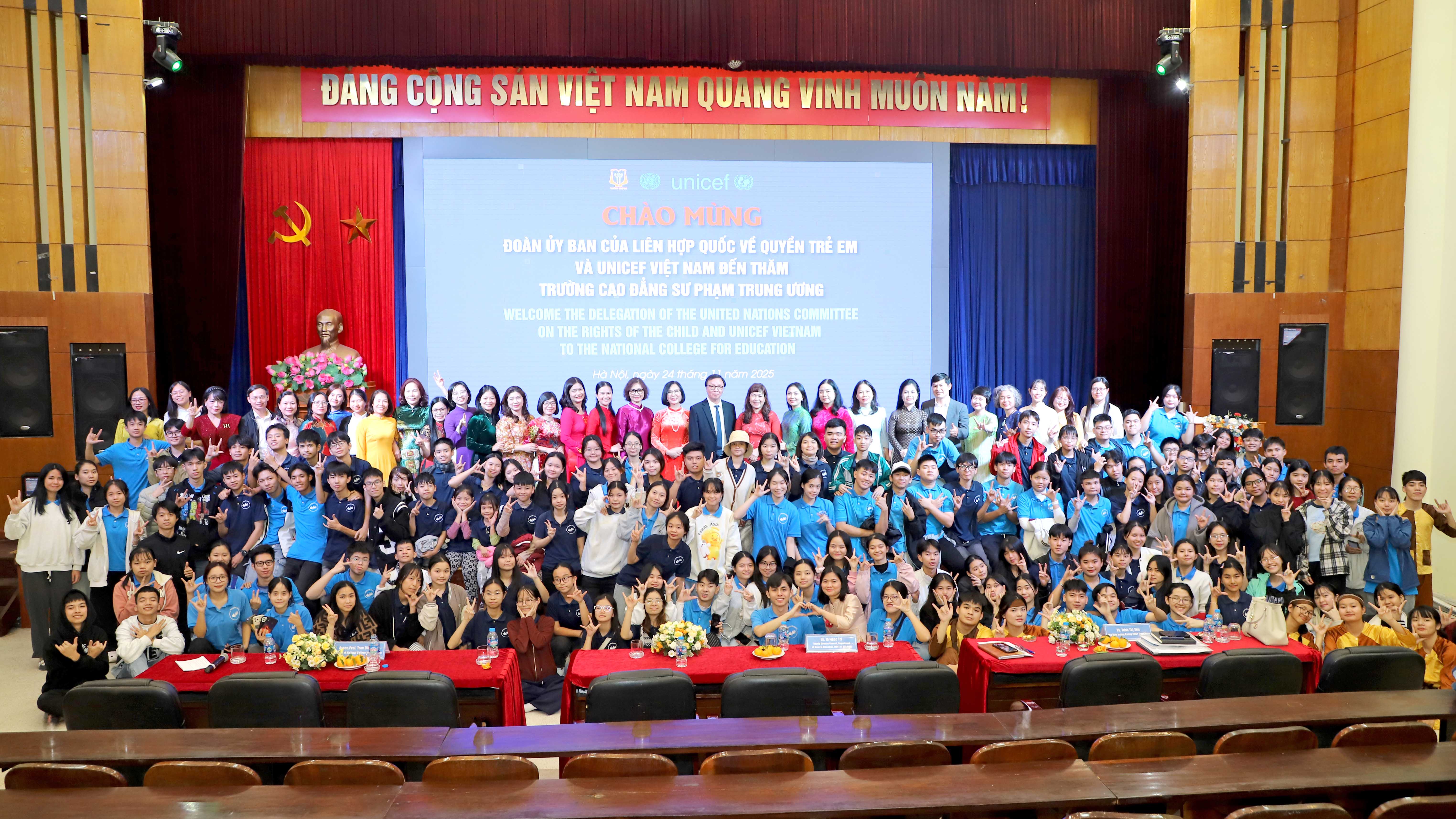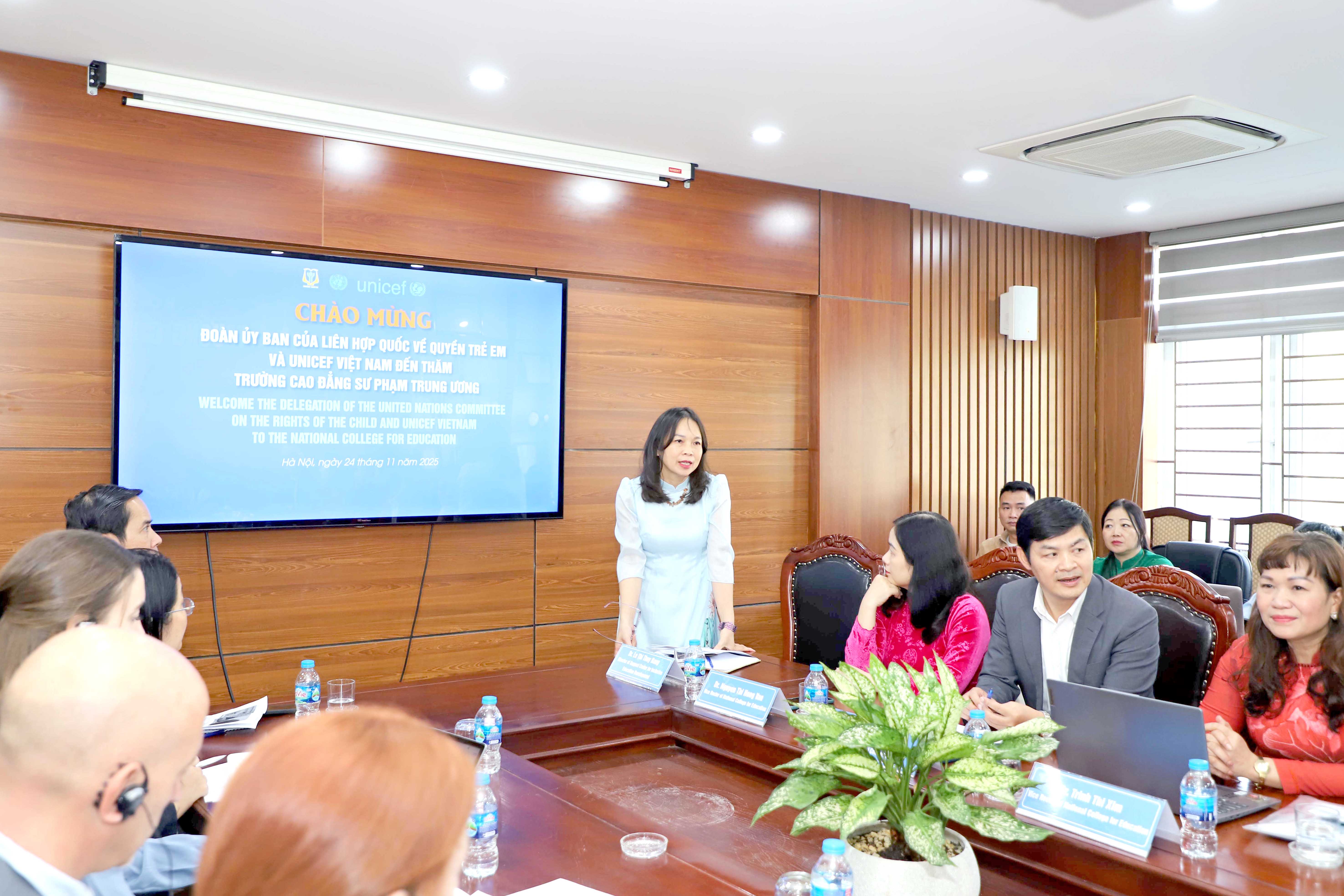 NCE Chiều ngày 24/11/2025, Đoàn Ủy ban của Liên Hợp Quốc về Quyền Trẻ em và đại diện UNICEF Việt Nam đã tham quan làm việc tại Trường Cao đẳng Sư phạm Trung ương (CĐSPTW). Trong khuôn khổ chuyến thăm, đoàn đã tới Trung tâm Hỗ trợ phát triển Giáo dục hòa nhập (HTPTGDHN) của Nhà trường. Tại đây, đoàn đã trực tiếp quan sát các hoạt động: trị liệu âm nhạc, can thiệp sớm, lớp học hòa nhập và mô hình giáo dục dành cho học sinh khiếm thính.