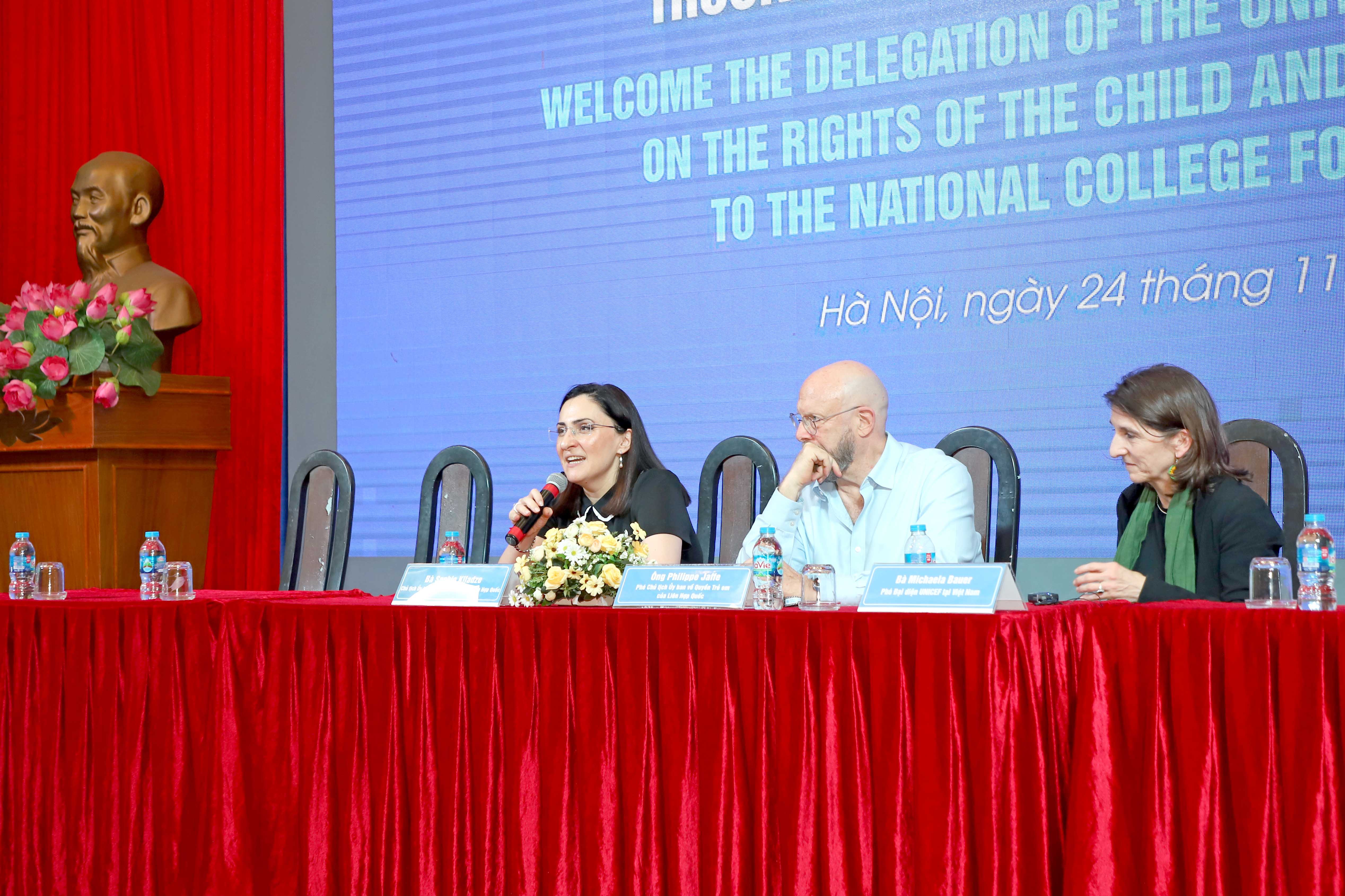 Ông Philippe Jaffe - Phó Chủ tịch Ủy ban về Quyền Trẻ em Liên Hợp Quốc chia sẻ: “Cảm ơn Nhà trường đã dành thời gian cho đoàn. Tôi hy vọng trong thời gian tới, chúng ta sẽ tiếp tục có những hợp tác chặt chẽ và bền vững hơn”.
