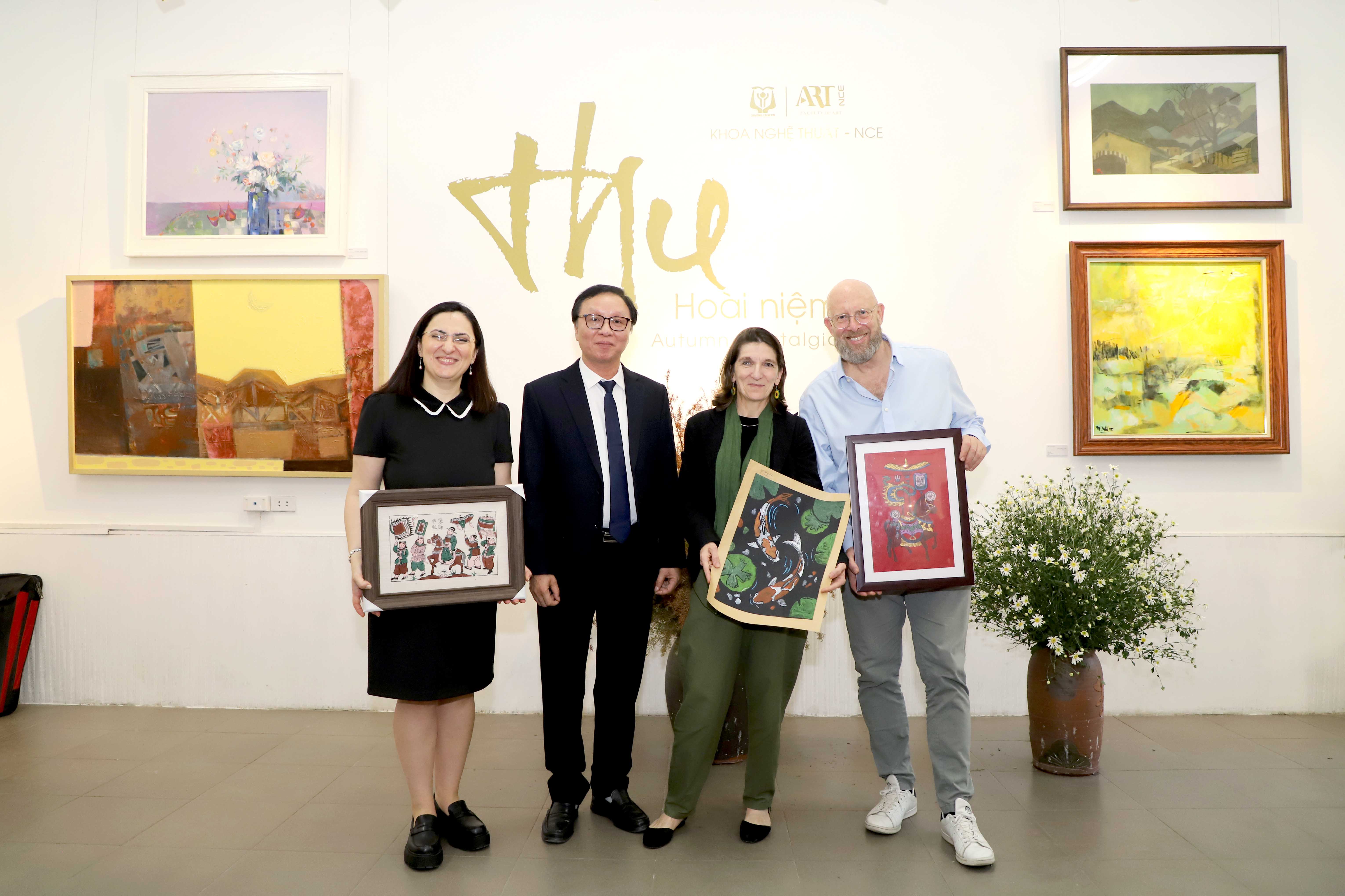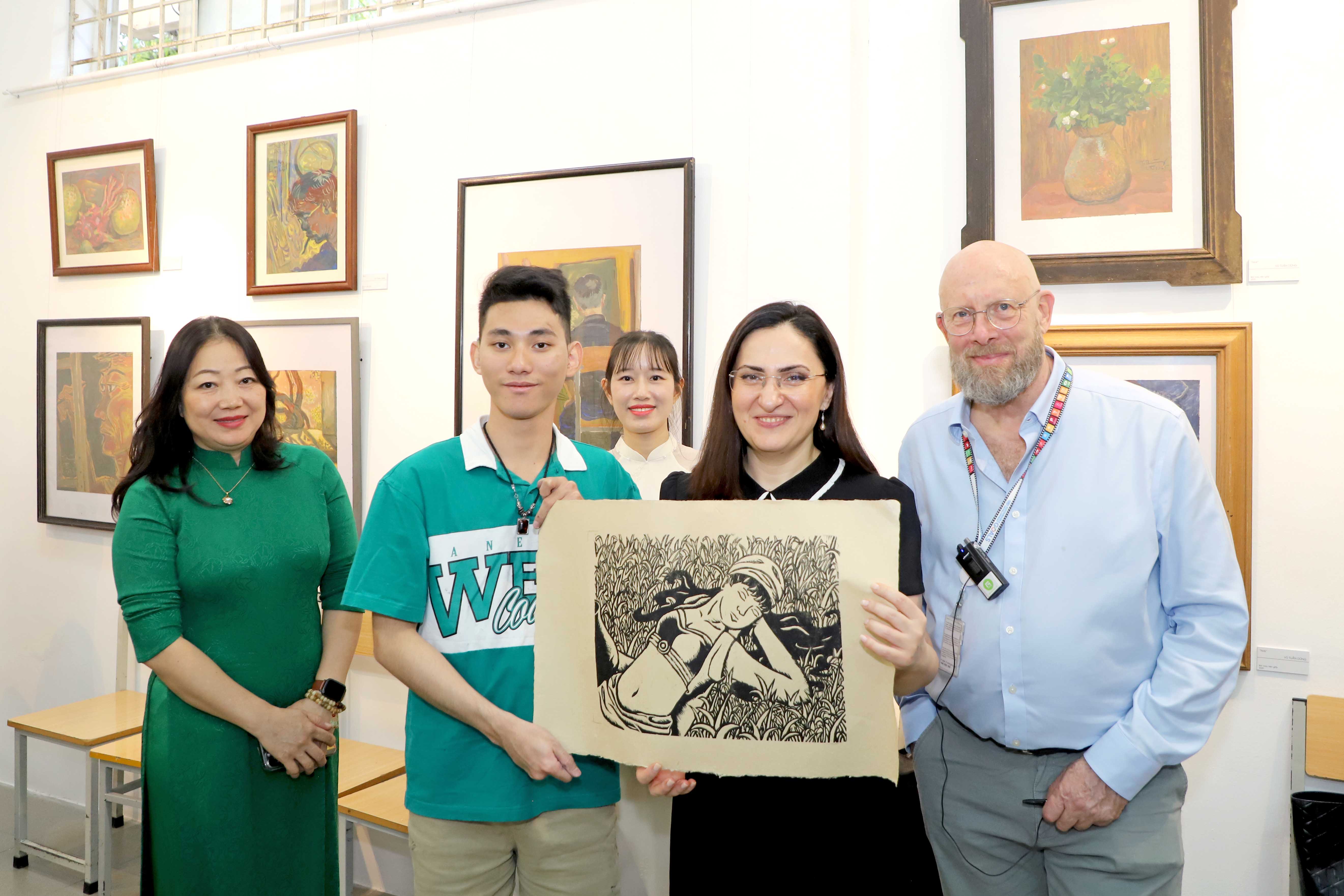 Ông Trần Đình Tuấn - Hiệu trường Nhà trường trao tặng quà lưu niệm chính là những tác phẩm