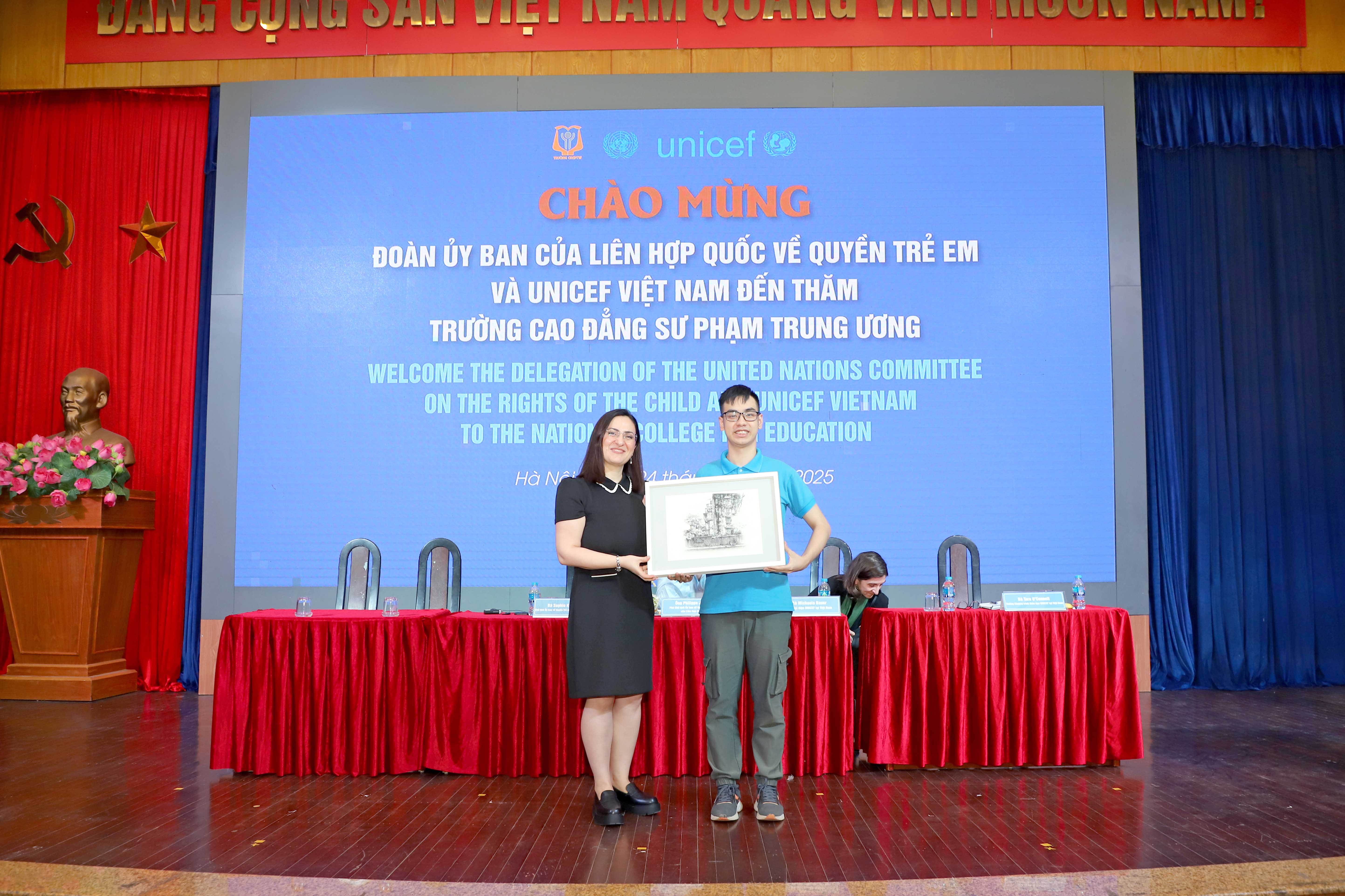 Nhiều em đã vượt qua khó khăn, nỗ lực phấn đấu từng ngày; có em hiện đang giữ những vị trí đáng tự hào. Điều đó cho thấy giấc mơ của các em hoàn toàn có thể trở thành hiện thực nếu tiếp tục kiên trì và được tạo điều kiện đúng mức. Trong buổi giao lưu, em Trần Nam Long - Học sinh điếc lớp 12A Trung tâm HTPTGDHN đã thay mặt học sinh, sinh viên tặng quà lưu niệm cho Bà Sophio Kiladze - Chủ tịch Ủy ban Quyền Trẻ em Liên Hợp Quốc.
