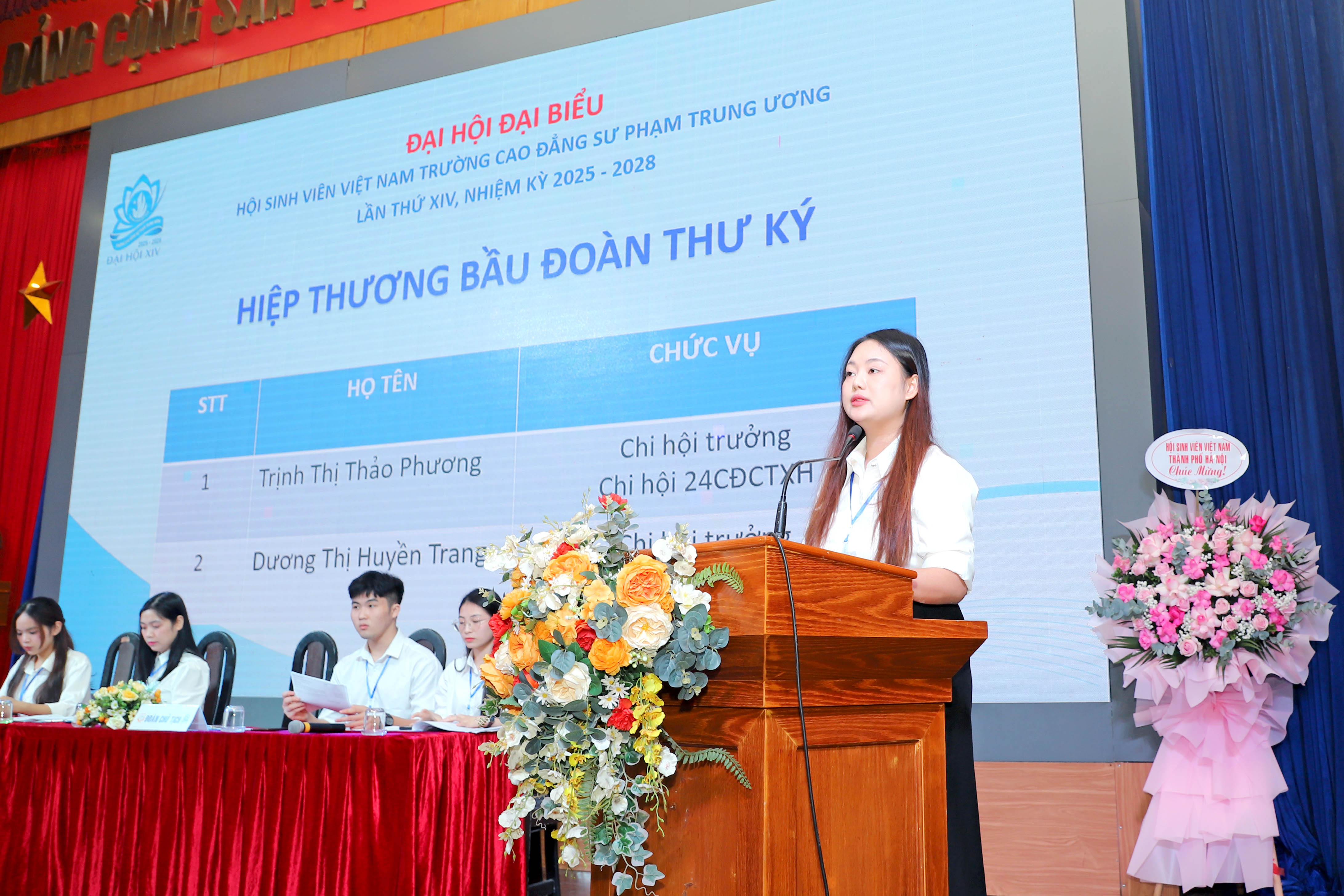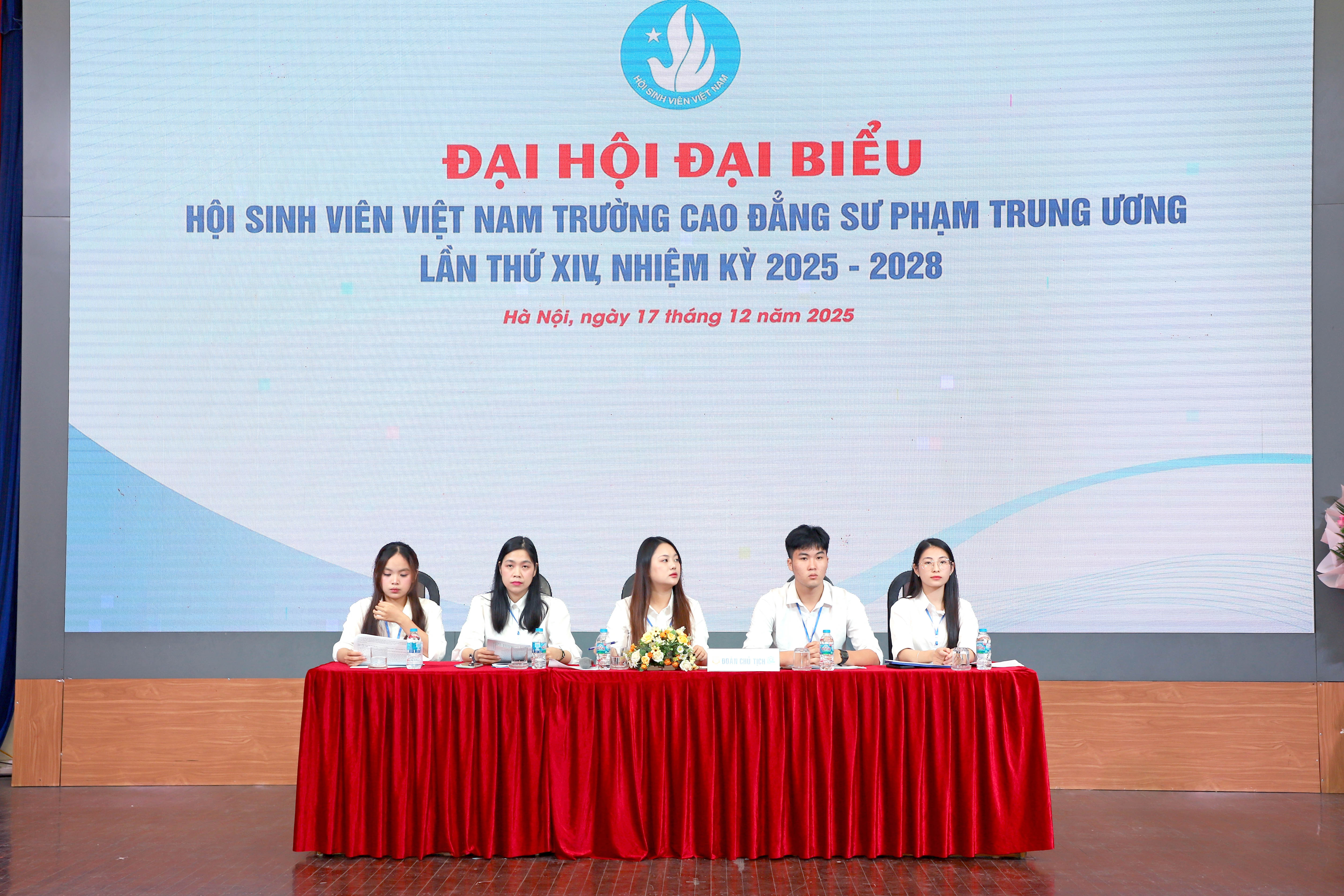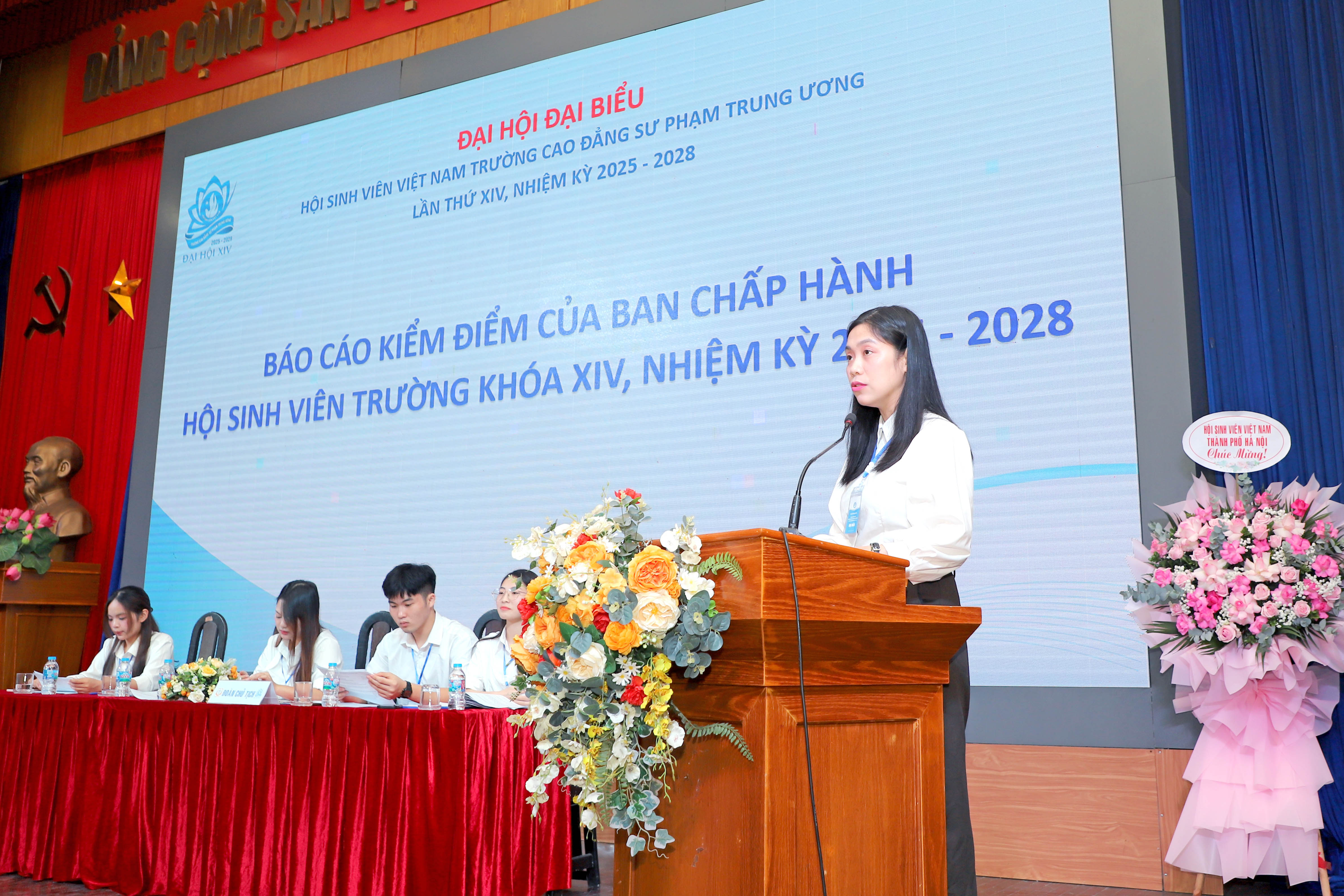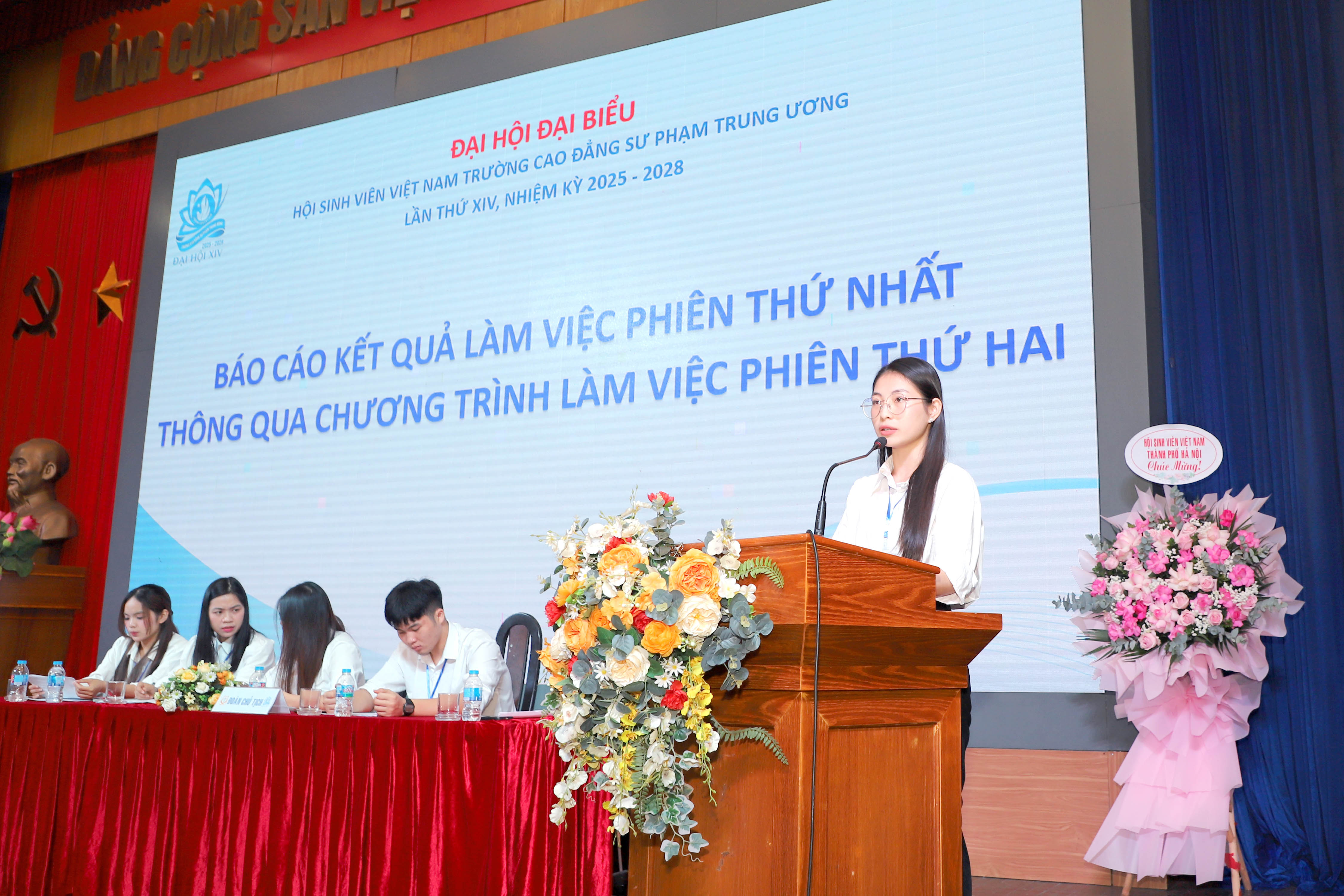 Đại hội Đại biểu Hội Sinh viên Trường CĐSPTW lần thứ XIV diễn ra trong 02 phiên. Tại phiên thứ nhất, Đại hội đã nghe đồng chí Ths Lê Thị Hồng Nhung - Phó Chủ tịch Hội Sinh viên trường khóa XIII trình bày báo cáo kiểm điểm của tập thể Ban Chấp hành Hội Sinh viên trường khóa XIII trên các mặt công tác, đồng thời Đại hội tiến hành hiệp thương bầu Ban Chấp hành Hội Sinh viên trường khóa XIV, nhiệm kỳ 2025-2028 gồm 17 đồng chí và Ban Kiểm tra Hội Sinh viên trường khóa XIV gồm 05 đồng chí.