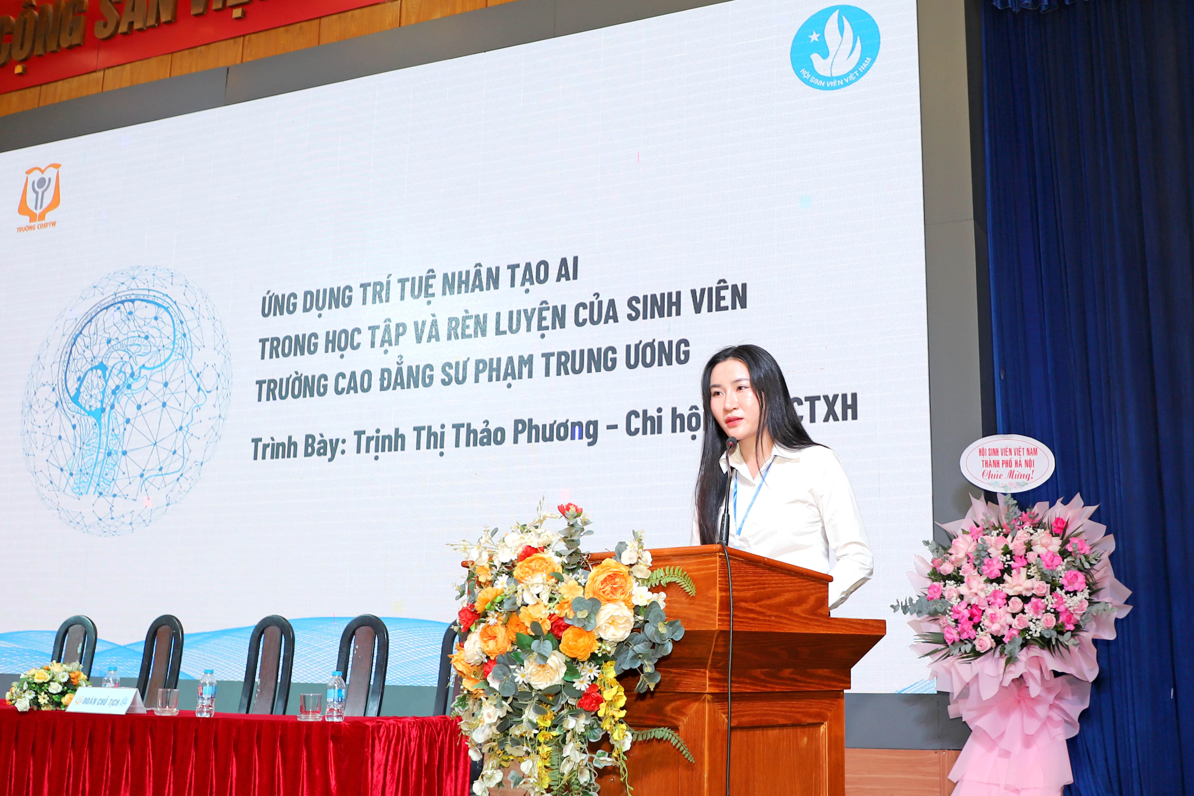 Sinh viên Trịnh Thị Thảo Phương - Chi hội 24CĐ CTXH trình bày tham luận “Ứng dụng trí tuệ nhân