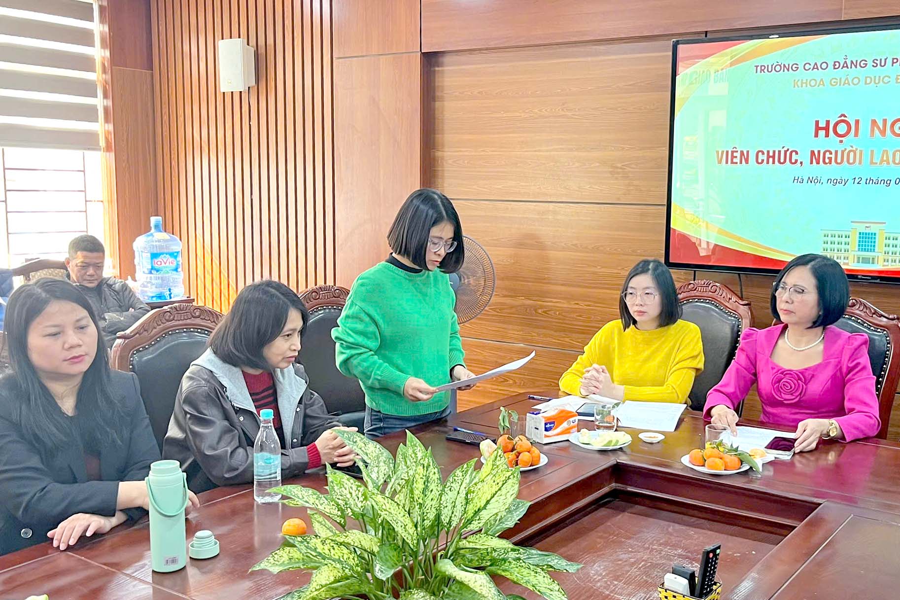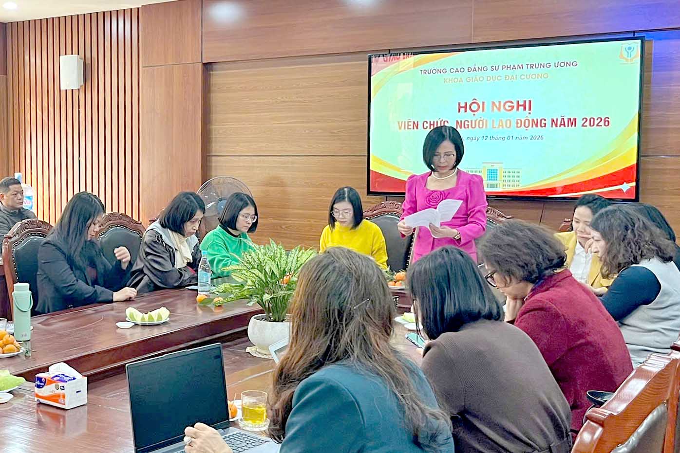 ThS. Trần Thùy Chi - Tổ trưởng Công đoàn báo cáo kiểm điểm việc thực hiện Nghị quyết Hội nghị viên chức, người lao động năm 2025 và phương hướng, nhiệm vụ năm 2026; đồng thời phát động phong trào thi đua năm 2026, thông qua báo cáo thu, chi, quản lý, sử dụng các khoản do viên chức, người lao động đóng góp.