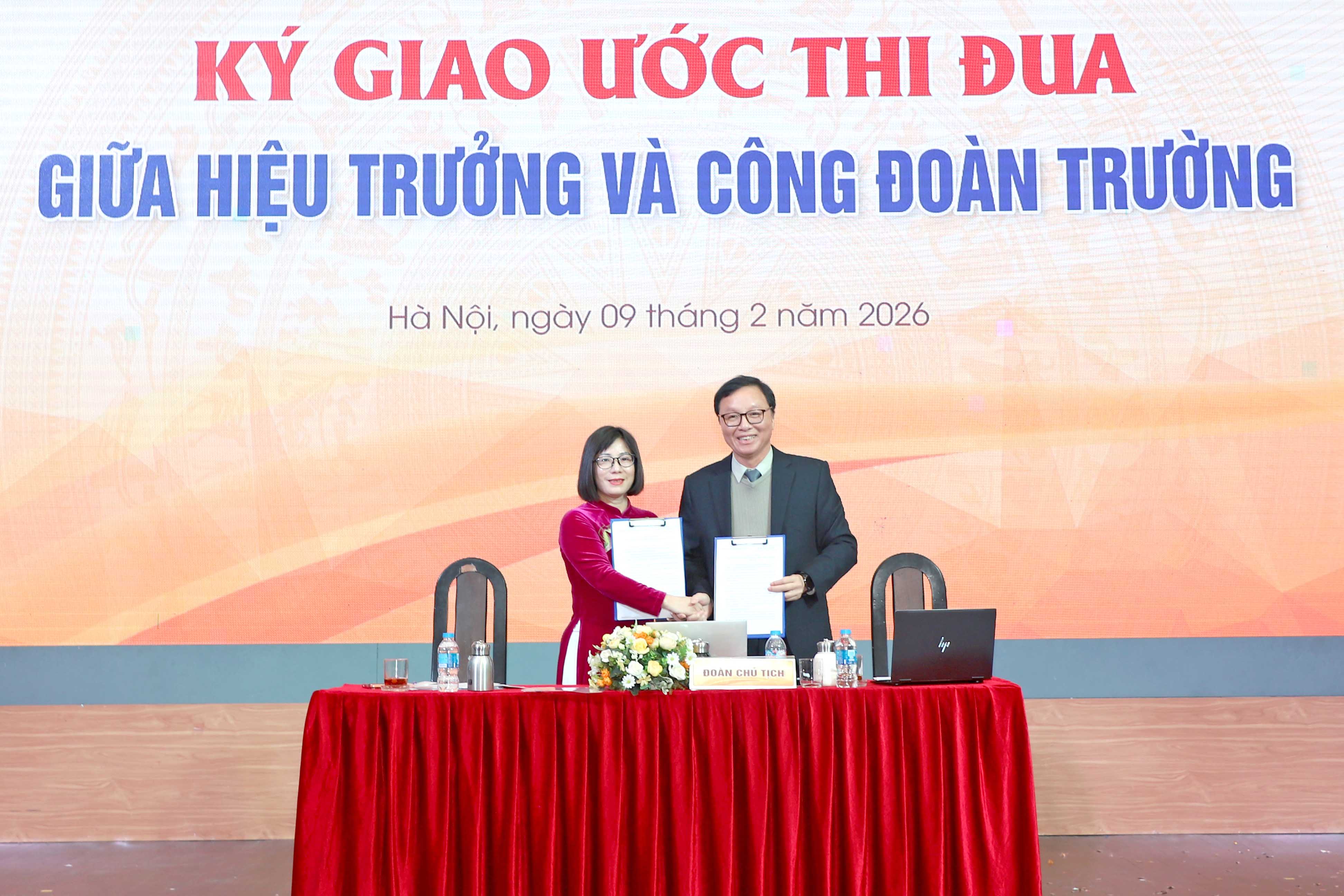 Để thúc đẩy phong trào thi đua năm 2026, TS. Nguyễn Thị Thanh Nga - Chủ tịch Công đoàn Trường đã phát động phong trào thi đua và ký kết giao ước thi đua giữa Hiệu trưởng và Công đoàn Trường. Sự kiện này không chỉ tạo nên sự thống nhất trong toàn trường mà còn đánh dấu sự khởi đầu cho một năm học mới với nhiều thành công. Toàn thể VC, NLĐ nhà trường cùng hướng tới mục tiêu chung là hoàn thành xuất sắc nhiệm vụ, nâng cao chất lượng đào tạo và xây dựng môi trường làm việc hiệu quả, hướng đến mục tiêu phát triển toàn diện và bền vững.
