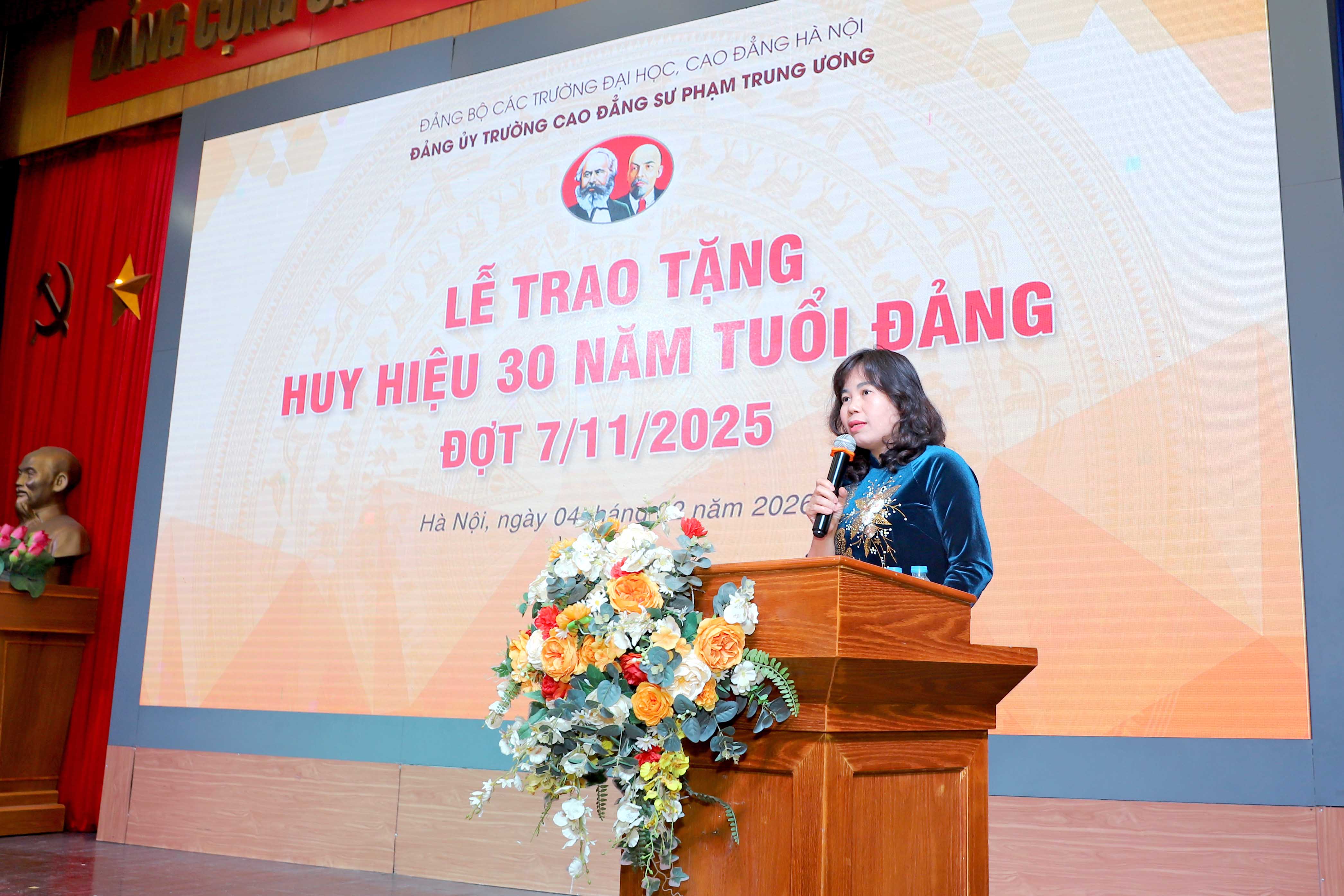 Phát biểu chỉ đạo tại buổi lễ, đồng chí Nguyễn Vũ Bích Hiền - Phó Bí thư Thường trực Đảng ủy các trường Đại học, Cao đẳng Hà Nội chúc mừng đồng chí Nguyễn Thị Hoài Thu vinh dự được nhận Huy hiệu 30 năm tuổi Đảng - huy hiệu cao quý dành cho những đảng viên trung kiên, mẫu mực. Đồng chí đồng thời biểu dương và ghi nhận những kết quả nổi bật của Đảng bộ Nhà trường trong năm 2025.