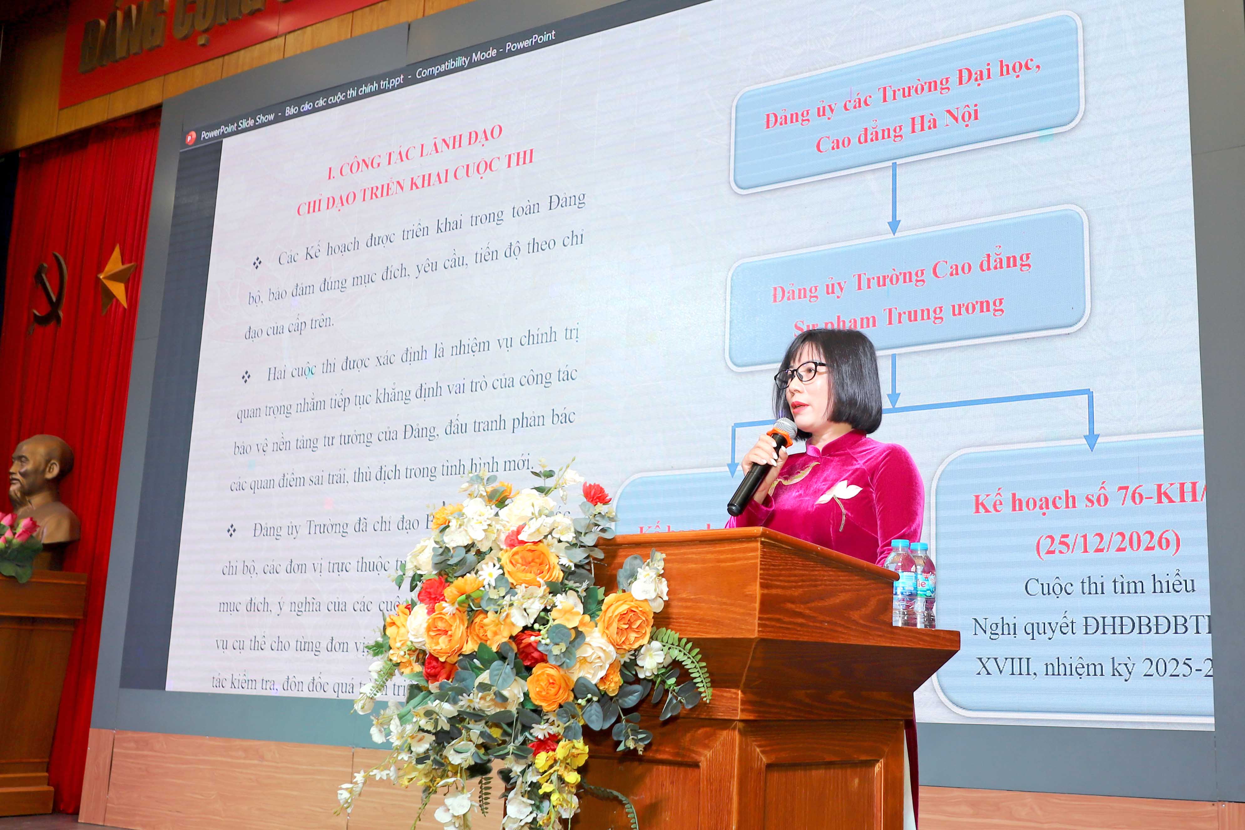 Tiếp theo chương trình, đồng chí Nguyễn Thị Thanh Nga - Đảng ủy viên, Trưởng Ban Tuyên giáo Đảng ủy báo cáo tổng kết Cuộc thi chính luận bảo vệ nền tảng tư tưởng của Đảng lần thứ Năm, năm 2025 tổ chức tại Trường Cao đẳng Sư phạm Trung ương và Cuộc thi tìm hiểu Nghị quyết Đại hội Đại biểu đảng vộ TP Hà Nội lần thứ XVIII, nhiệm kỳ 2025-2030.