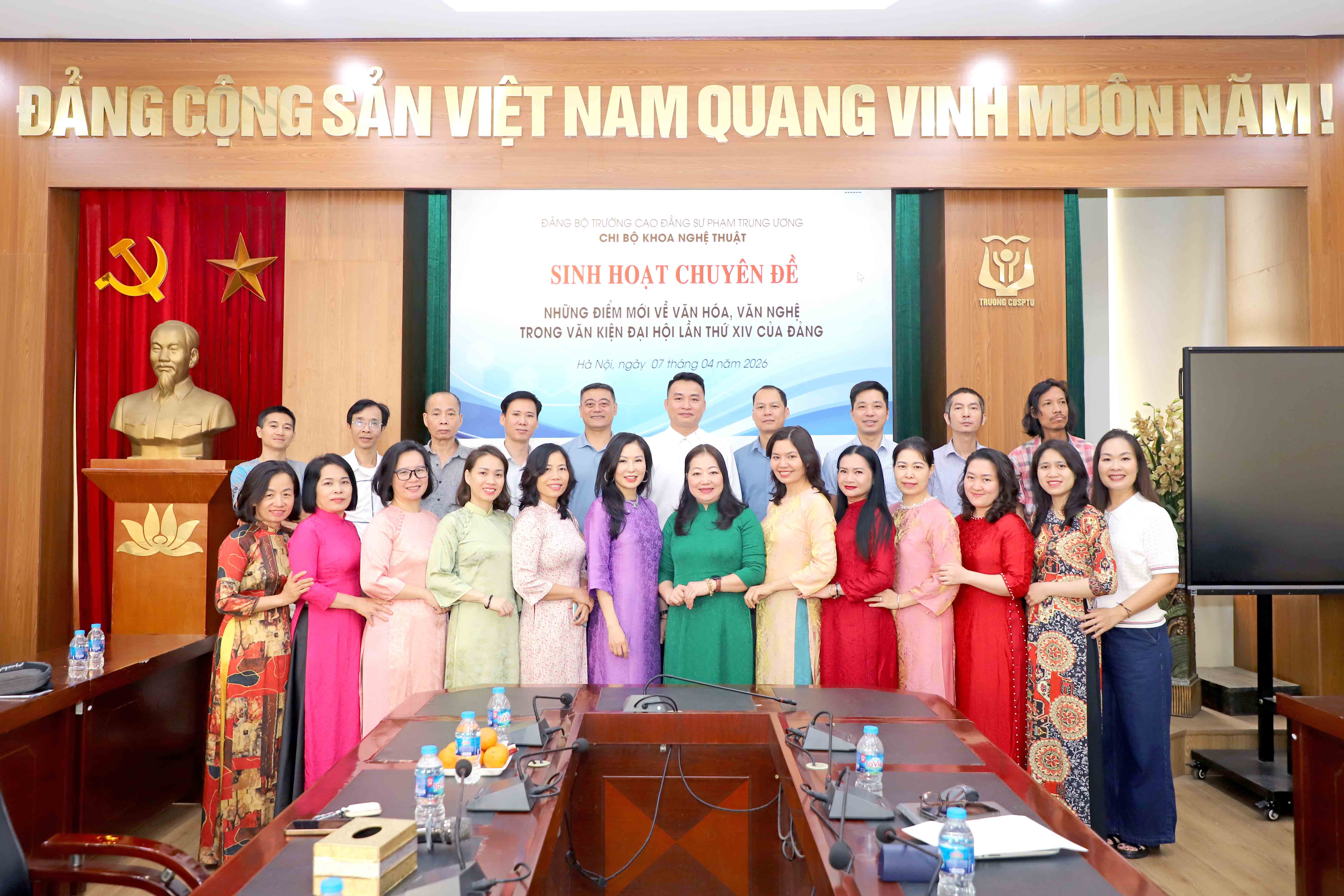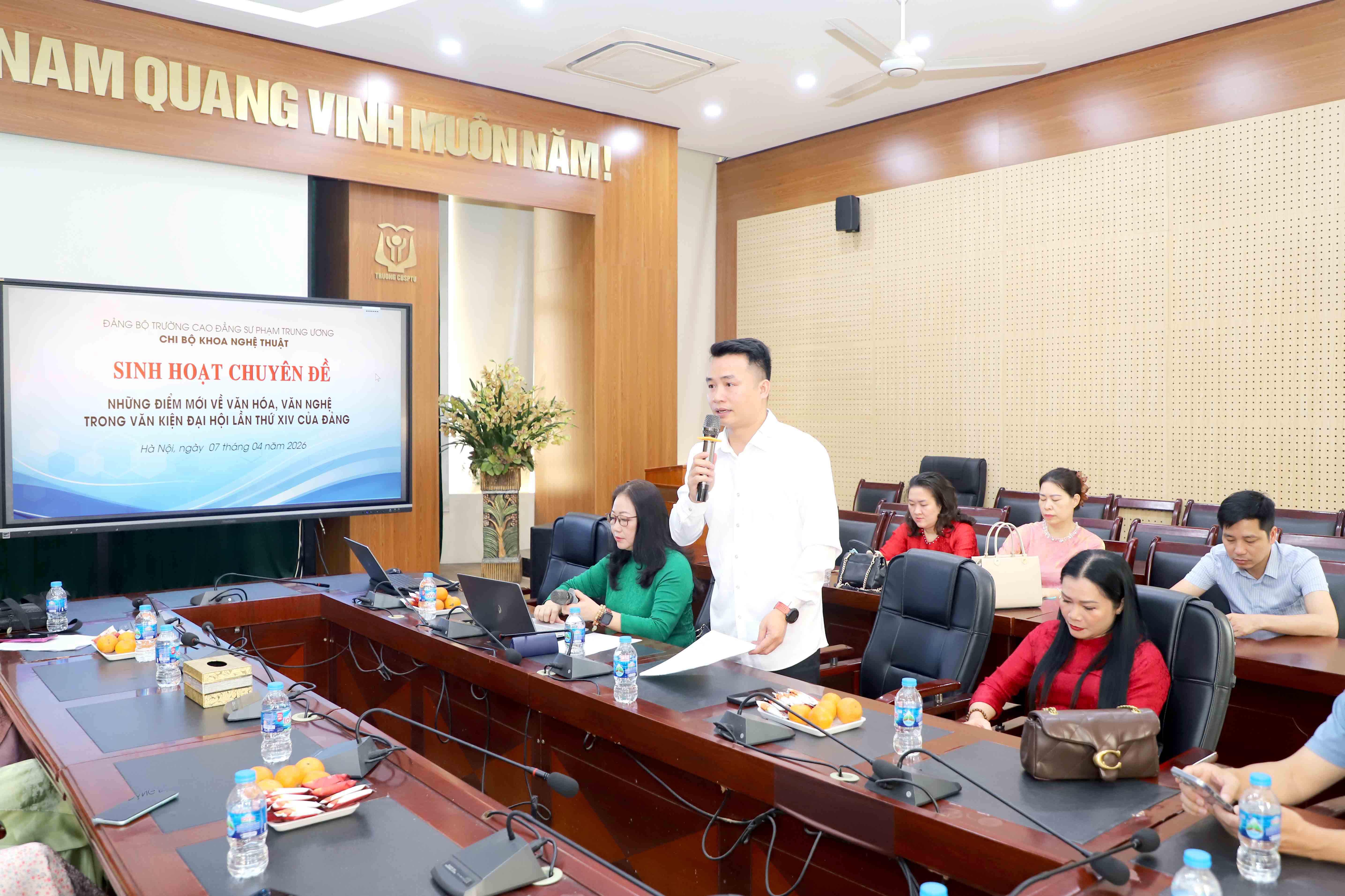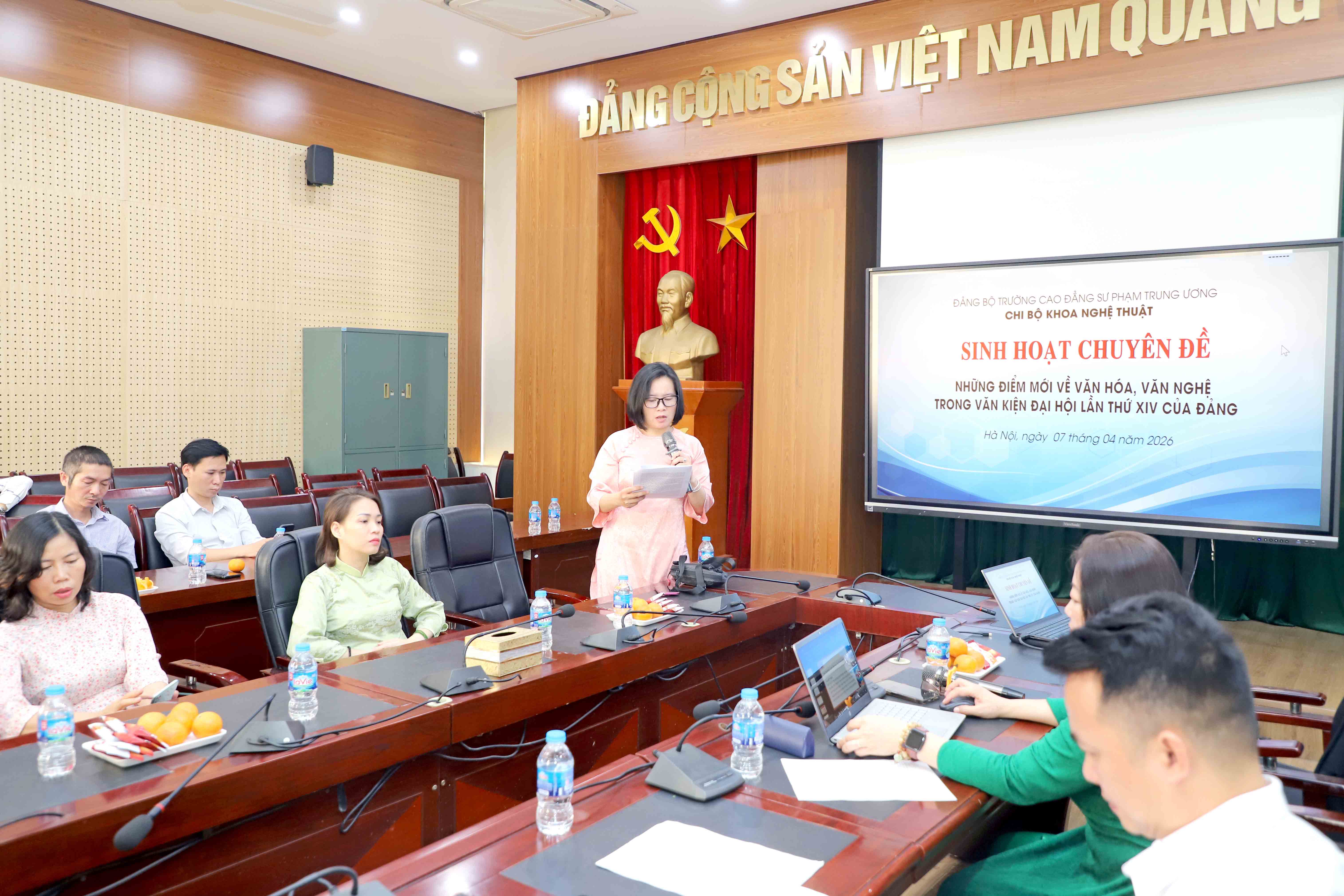 NCE  Thực hiện Kế hoạch của Đảng bộ trường Cao đẳng Sư phạm Trung ương về Tổ chức sinh hoạt chính trị năm 2026. Được sự chỉ đạo của Đảng ủy, Ban giám hiệu, sáng ngày 07 tháng 04 năm 2026 Chi bộ Khoa Nghệ thuật đã tổ chức: “Sinh hoạt chuyên đề những điểm mới về văn hoá, văn nghệ trong văn kiện Đại hội lần thứ XIV của Đảng”.