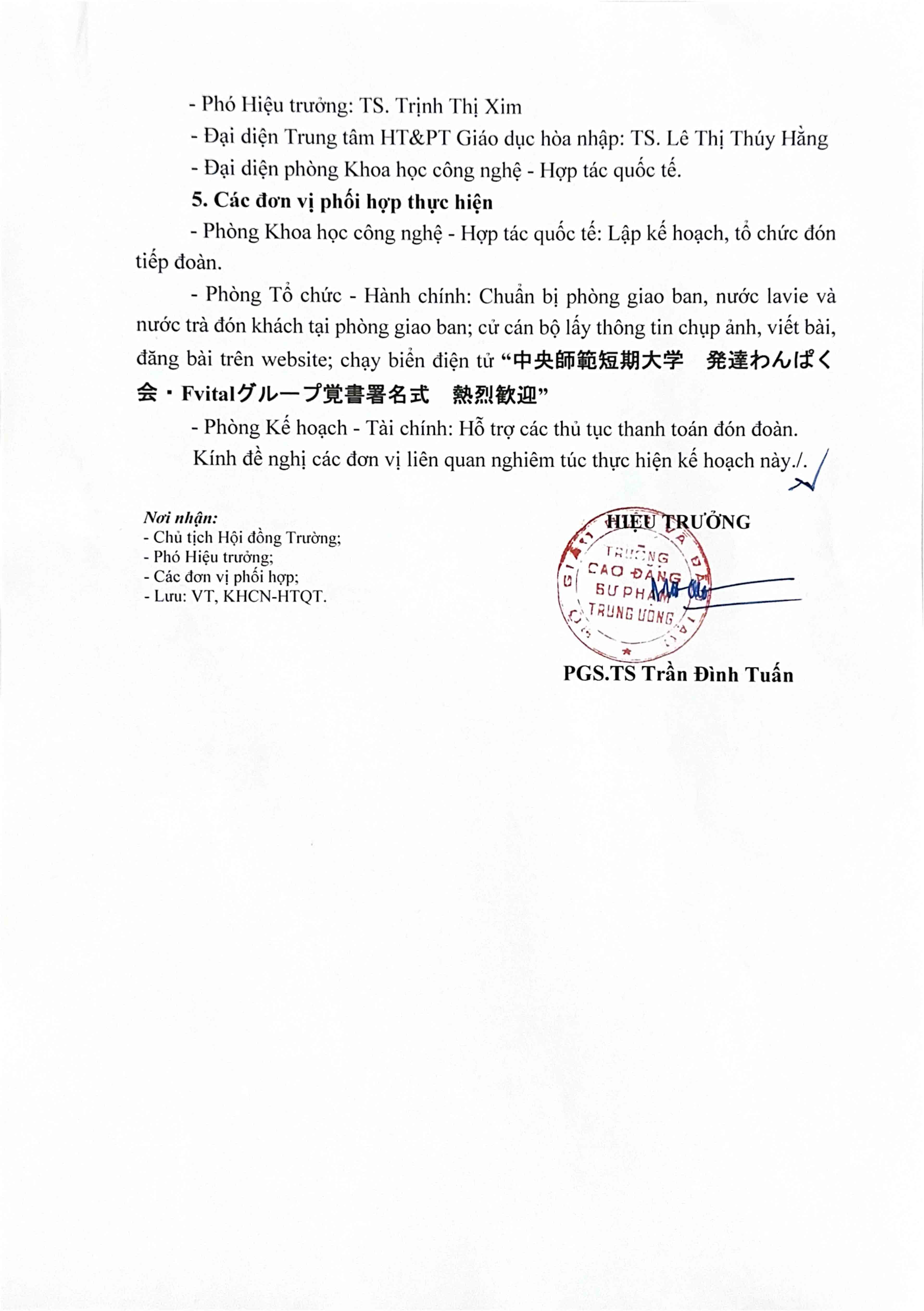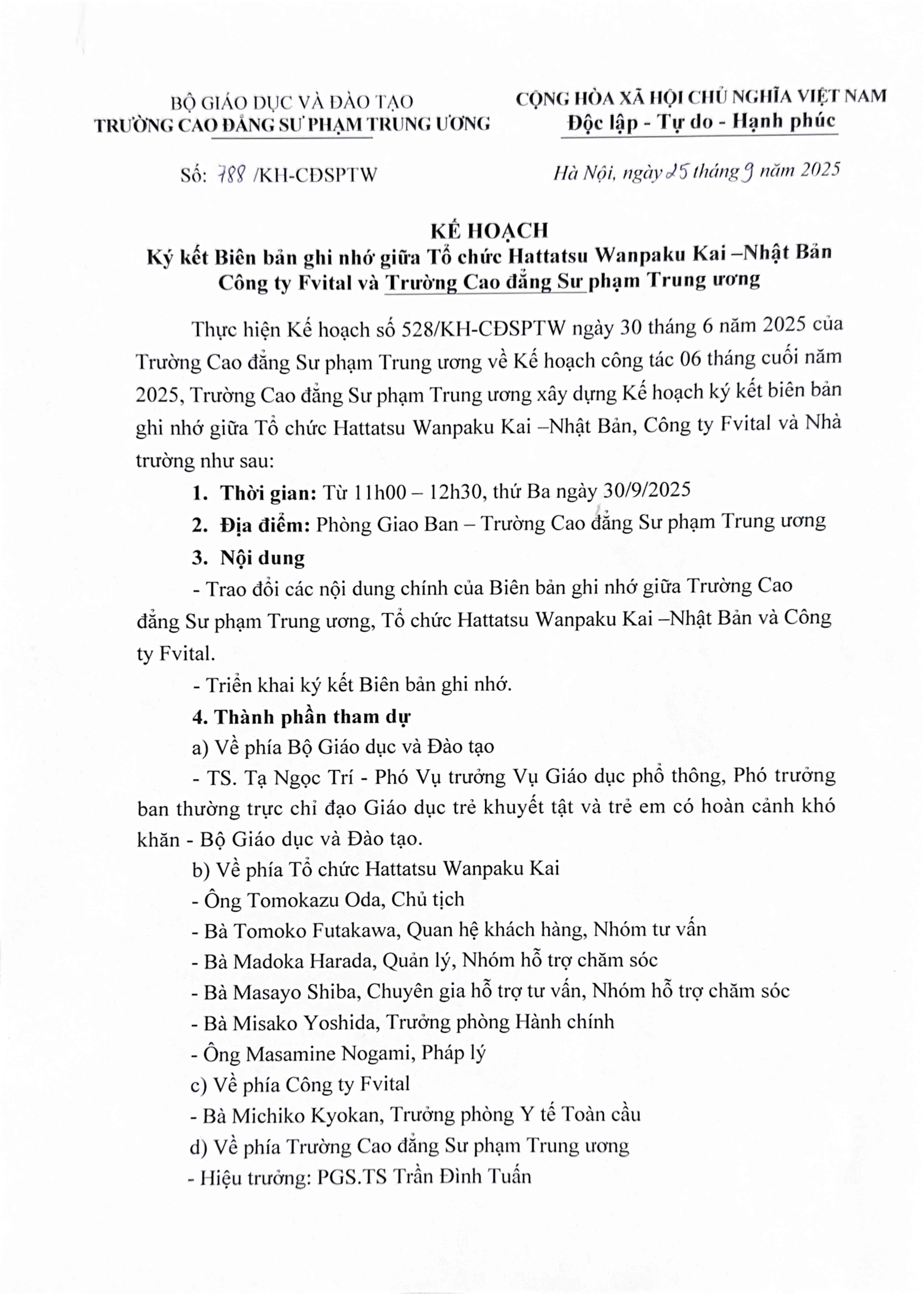 Ký kết Biên bản ghi nhớ giữa Tổ chức Hattatsu Wanpaku Kai –Nhật Bản Công ty Fvital và Trường Cao đẳng Sư phạm Trung ương