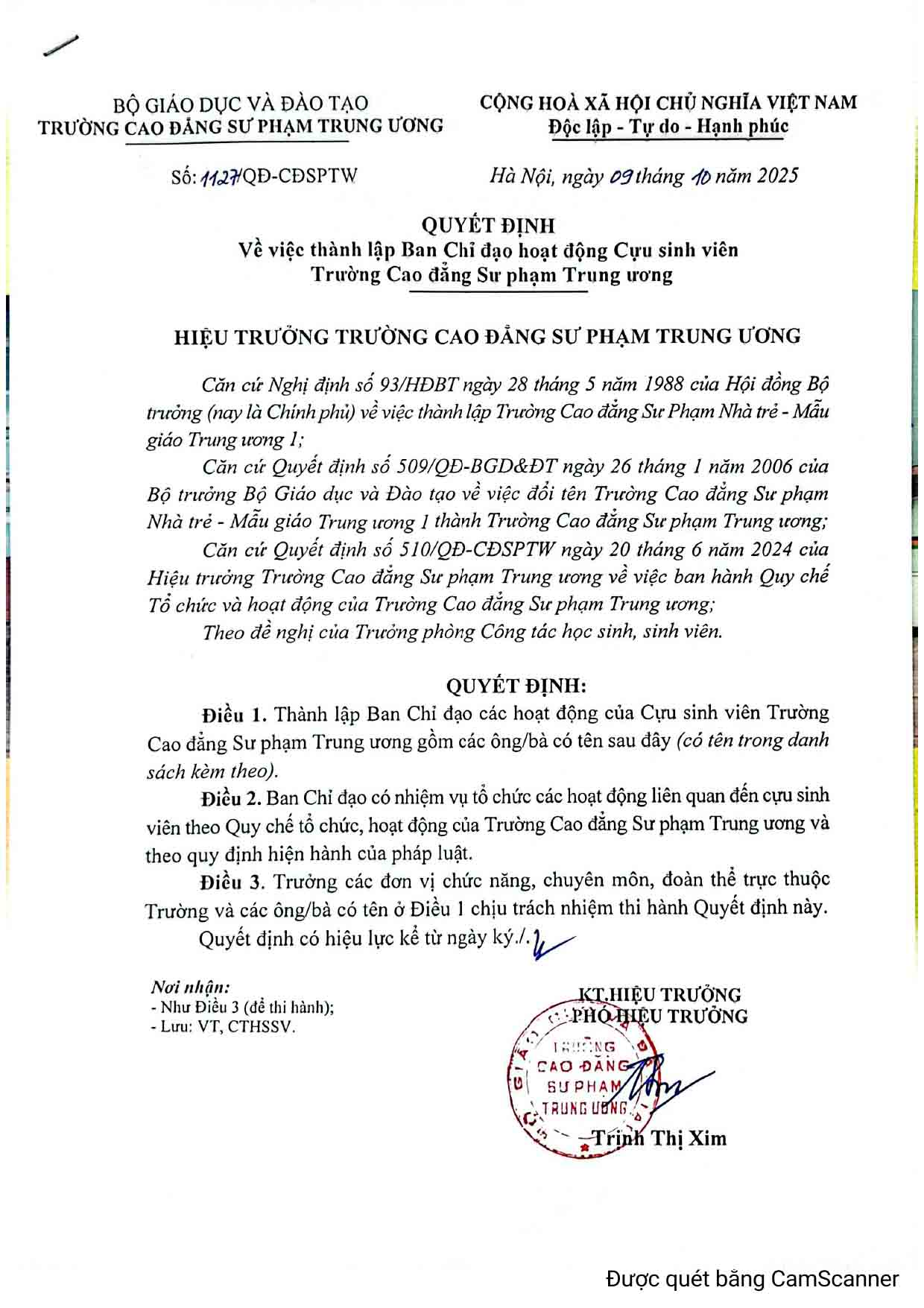Quyết định về việc thành lập Ban Chỉ đạo hoạt động Cựu sinh viên Trường Cao đẳng Sư phạm Trung ương (có danh sách kèm theo)