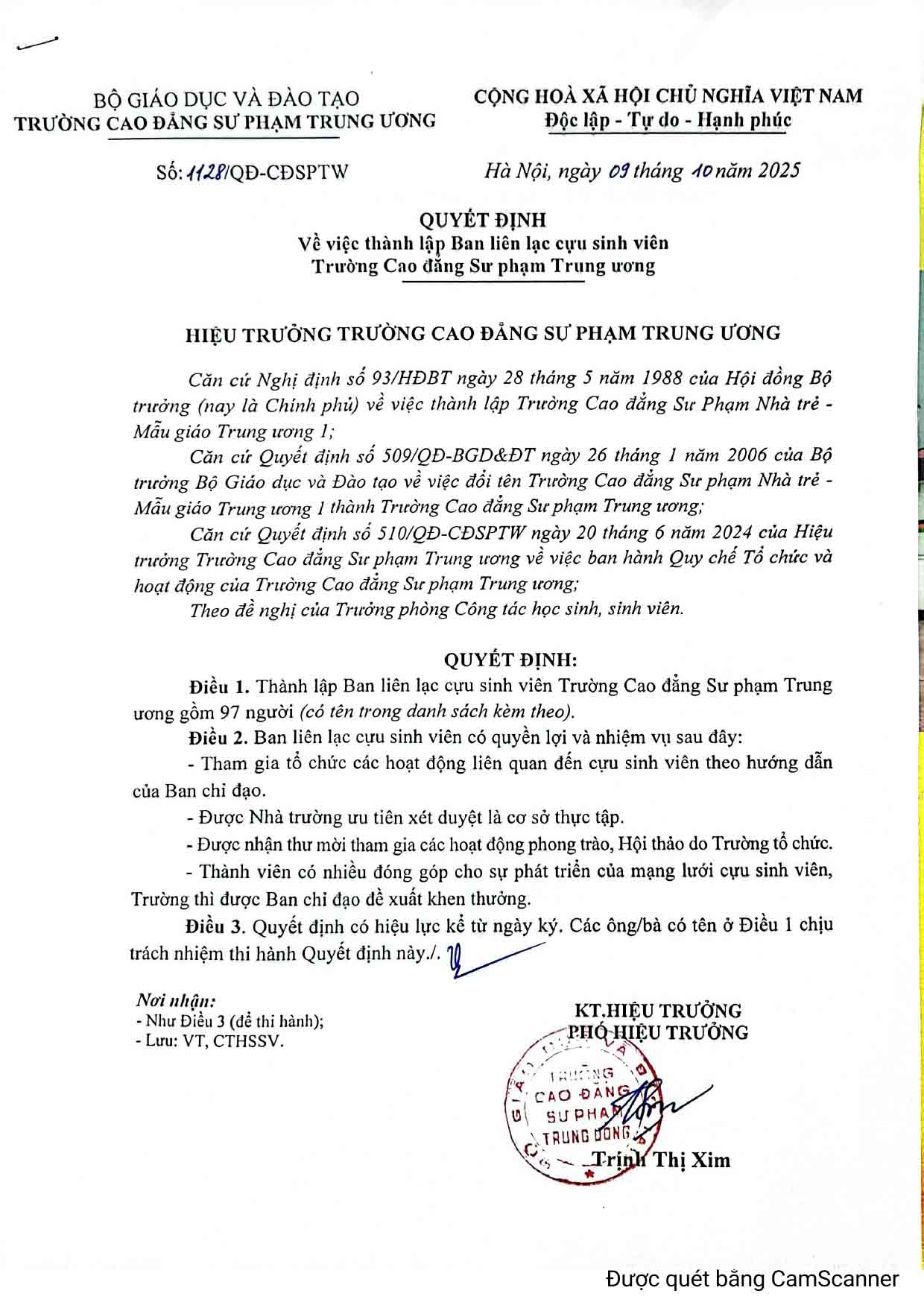 Quyết định về việc thành lập Ban liên lạc cựu sinh viên Trường Cao đẳng Sư phạm Trung ương (có danh sách kèm theo)