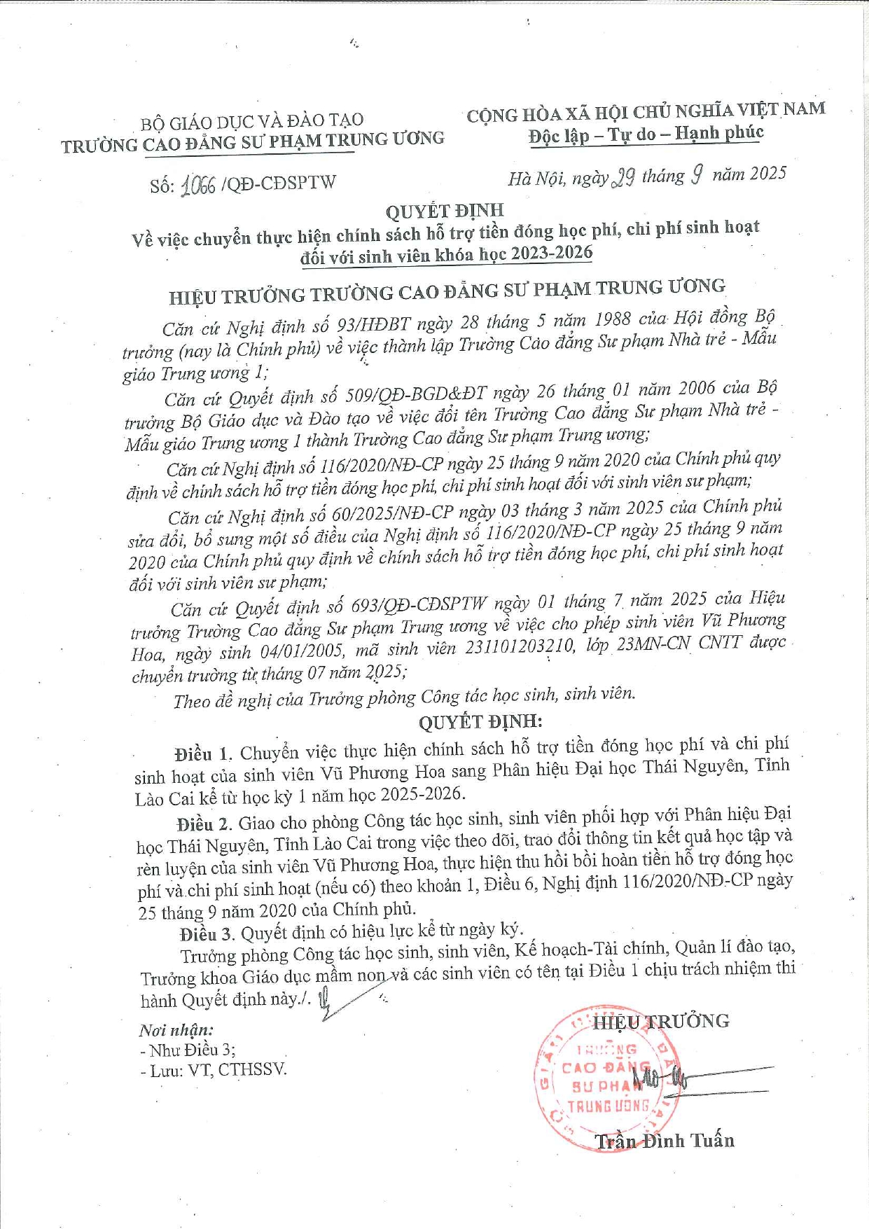 Quyết định Về việc chuyển thực hiện chính sách hỗ trợ tiền đóng học phí, chi phí sinh hoạt đối với sinh viên khóa học 2023-2026