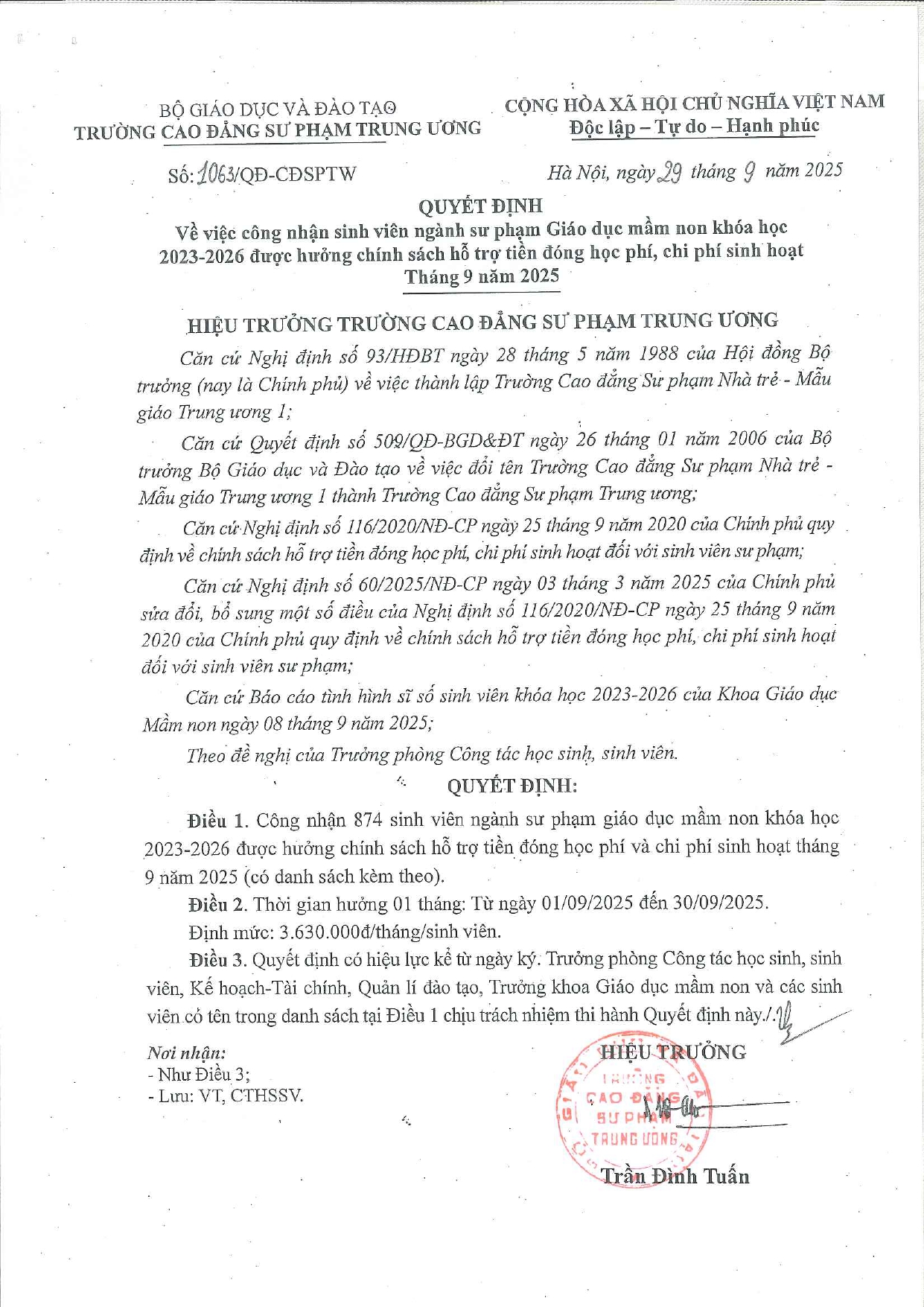 Quyết định Về việc công nhận sinh viên ngành sư phạm Giáo dục mầm non khóa học 2023-2026 được hưởng chính sách hỗ trợ tiền đóng học phí, chi phí sinh hoạt Tháng 9 năm 2025 (Có danh sách sinh viên CĐ chính quy ngành GDMN khóa học 2023-2026 kèm theo)
