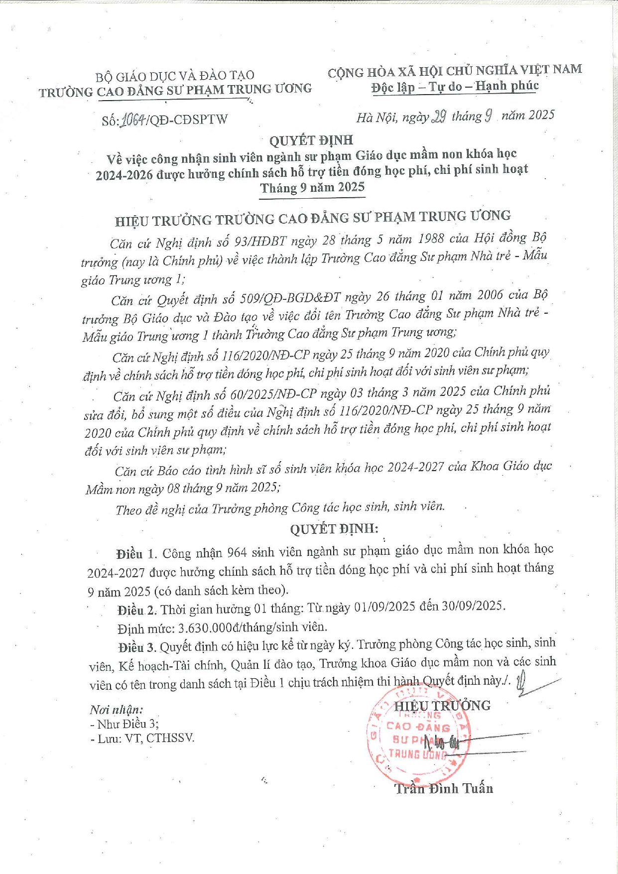 Quyết định Về việc công nhận sinh viên ngành sư phạm Giáo dục mầm non khóa học 2024-2026 được hưởng chính sách hỗ trợ tiền đóng học phí, chi phí sinh hoạt Tháng 9 năm 2025 (Có danh sách sinh viên CĐ chính quy ngành GDMN khóa học 2024-2027 kèm theo)
