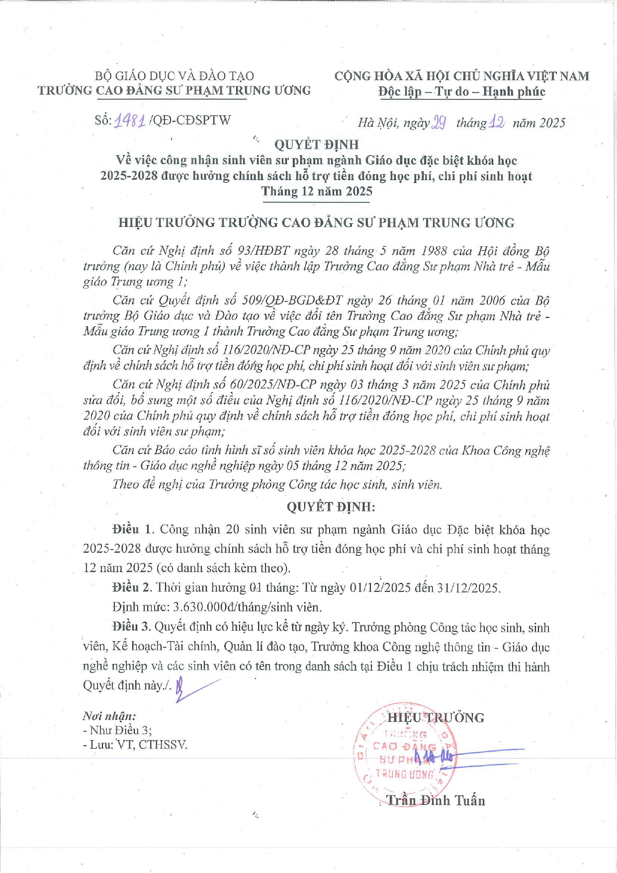 Quyết định Về việc công nhận sinh viên ngành Giáo dục đặc biệt khóa học 2025-2028 được hưởng chính sách hỗ trợ tiền đóng học phí, chi phí sinh hoạt tháng 12 năm 2025 (Có danh sách kèm theo)