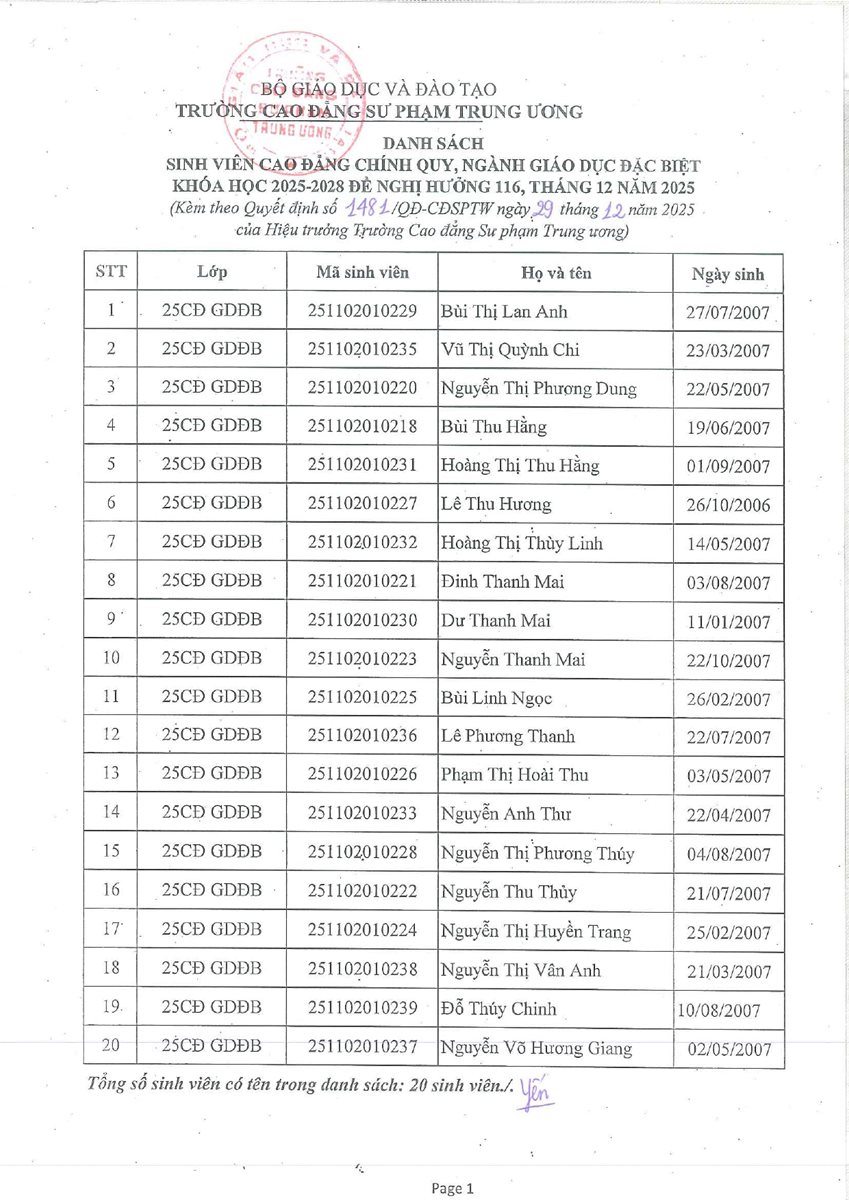 Quyết định Về việc công nhận sinh viên ngành Giáo dục đặc biệt khóa học 2025-2028 được hưởng chính sách hỗ trợ tiền đóng học phí, chi phí sinh hoạt tháng 12 năm 2025 (Có danh sách kèm theo)