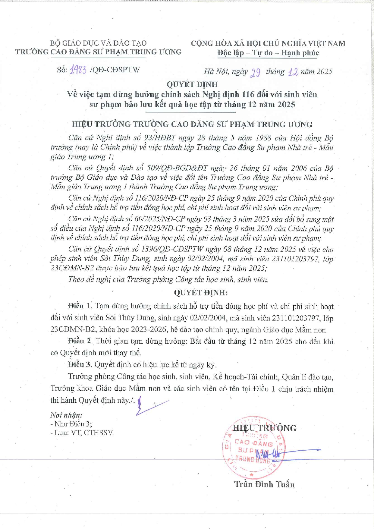 Quyết định Về việc tạm dừng hưởng chính sách Nghị định số 116 đối với sinh viên sư phạm bảo lưu kết quả học tập từ tháng 12 năm 2025
