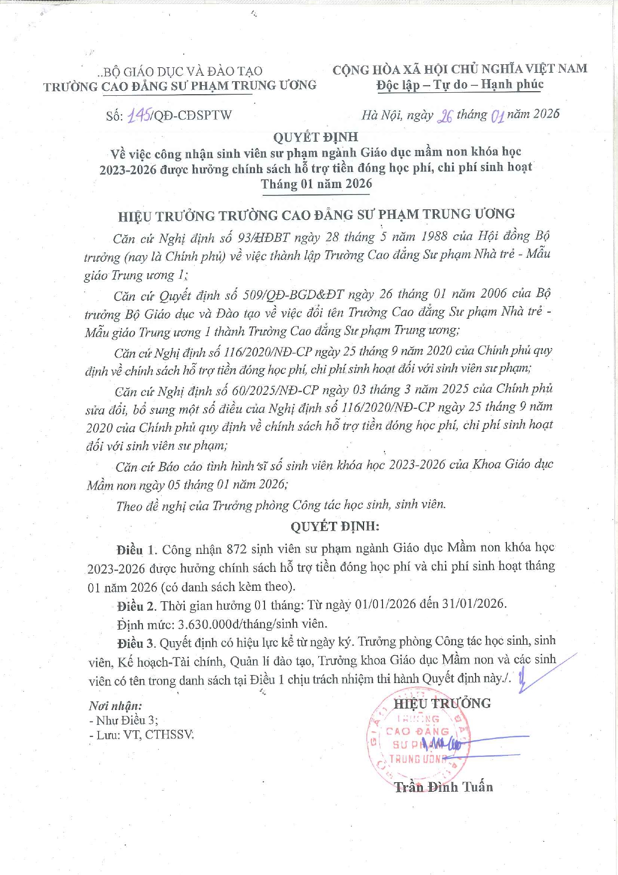 Quyết định Về việc công nhận sinh viên sư phạm ngành Giáo dục mầm non khóa học 2023-2026 được hưởng chính sách hỗ trợ tiền đóng học phí, chi phí sinh hoạt Tháng 01 năm 2026 (Có danh sách kèm theo)
