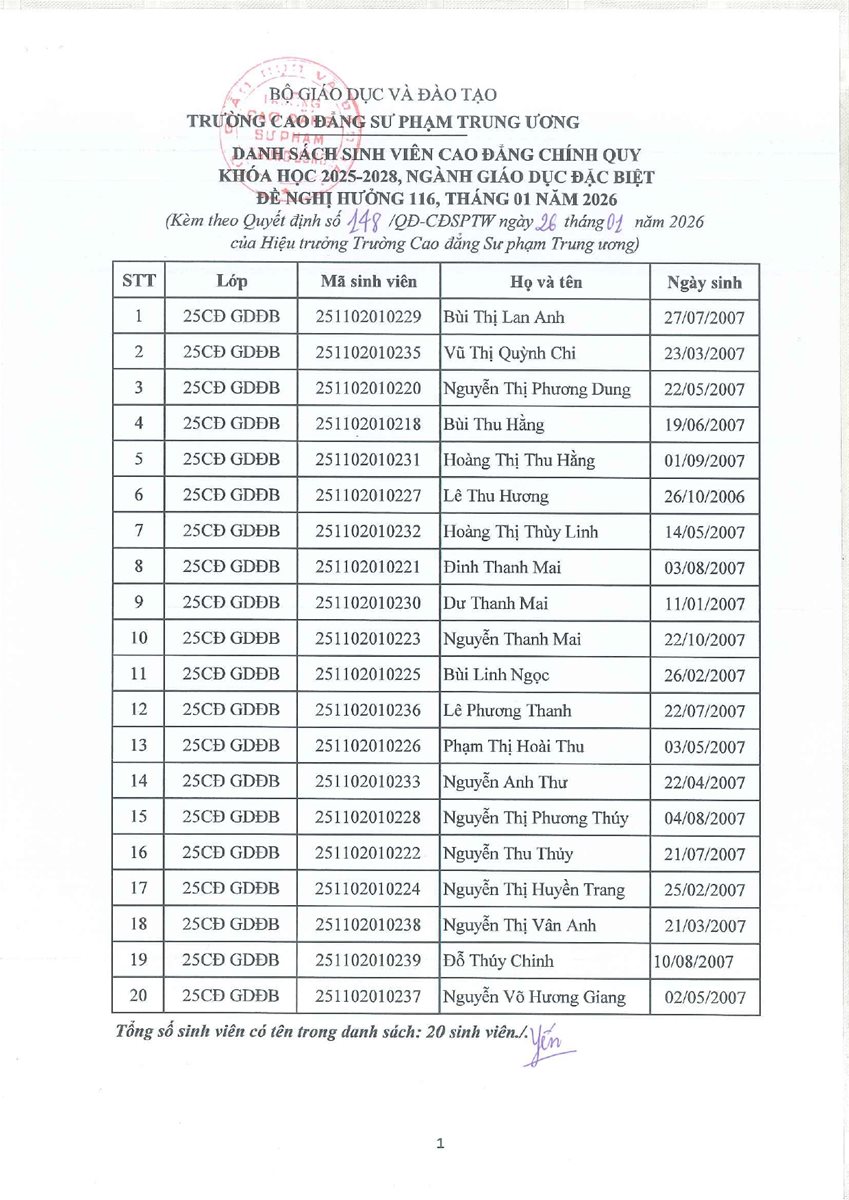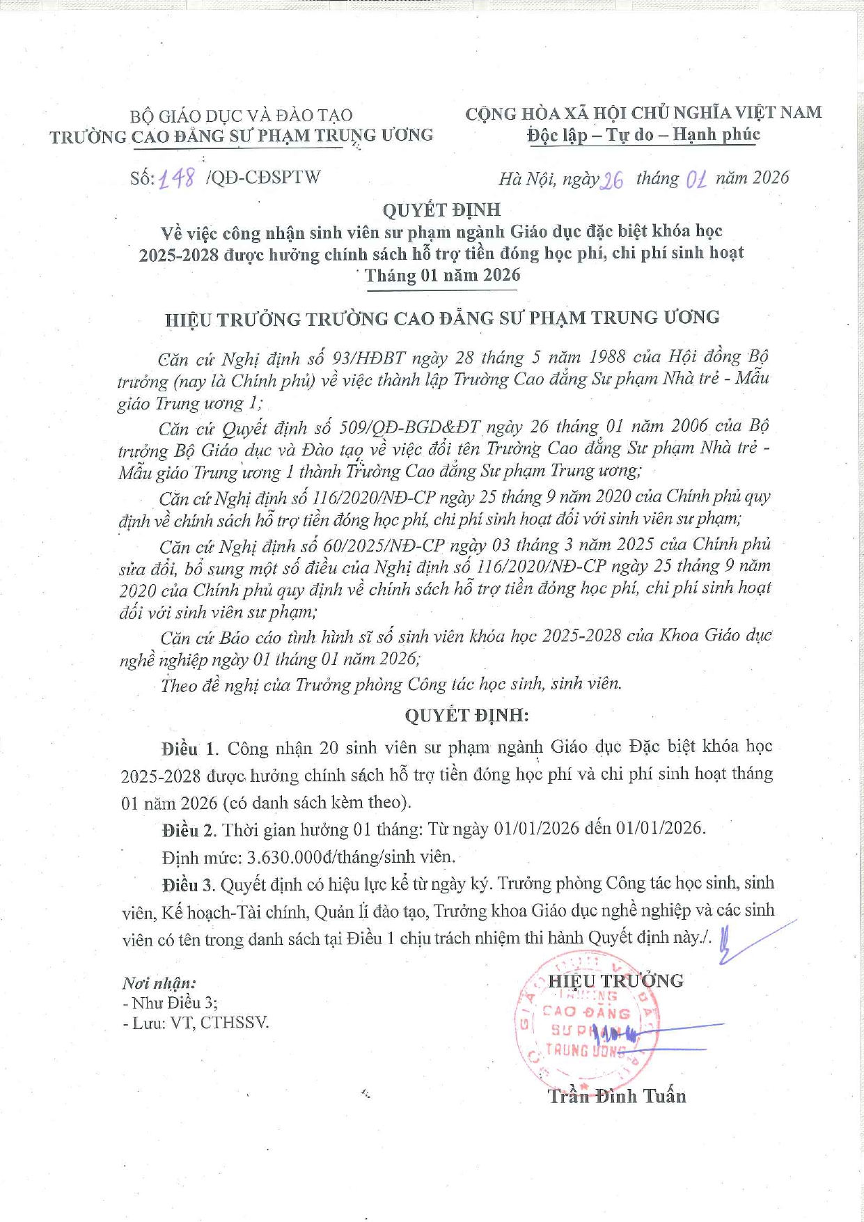 Quyết định Về việc công nhận sinh viên sư phạm ngành Giáo dục đặc biệt khóa học 2025-2028 được hưởng chính sách hỗ trợ tiền đóng học phí, chi phí sinh hoạt Tháng 01 năm 2026 (Có danh sách kèm theo)