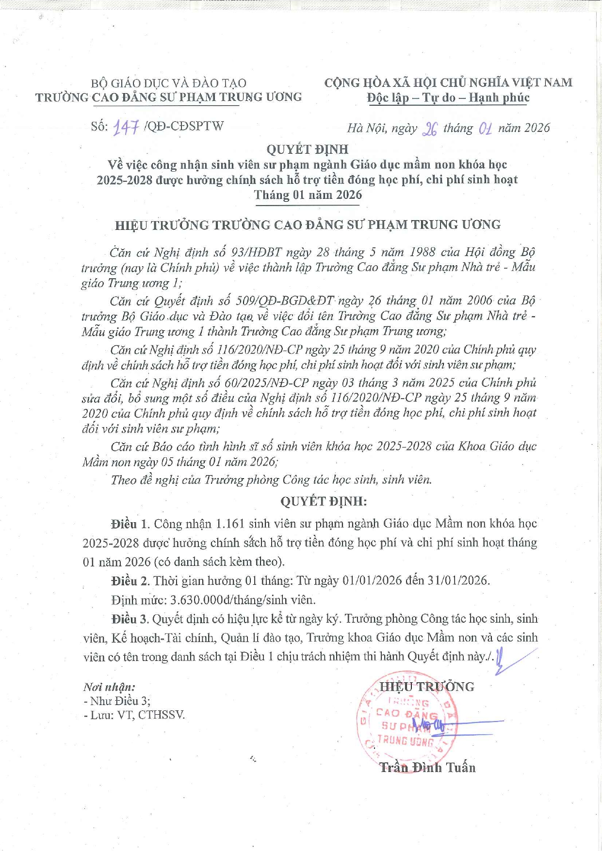 Quyết định Về việc công nhận sinh viên sư phạm ngành Giáo dục mầm non khóa học 2025-2028 được hưởng chính sách hỗ trợ tiền đóng học phí, chi phí sinh hoạt Tháng 01 năm 2026 (Có danh sách kèm theo)