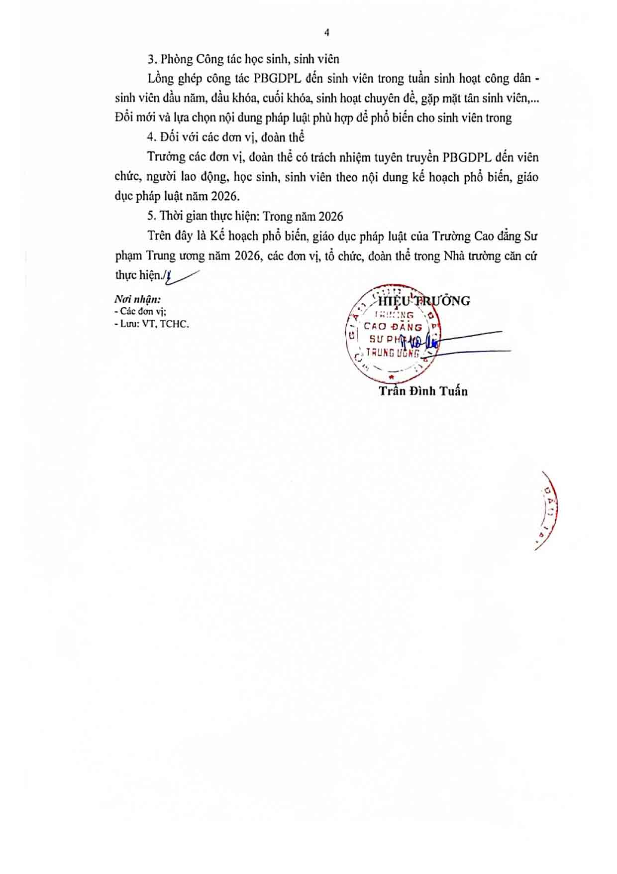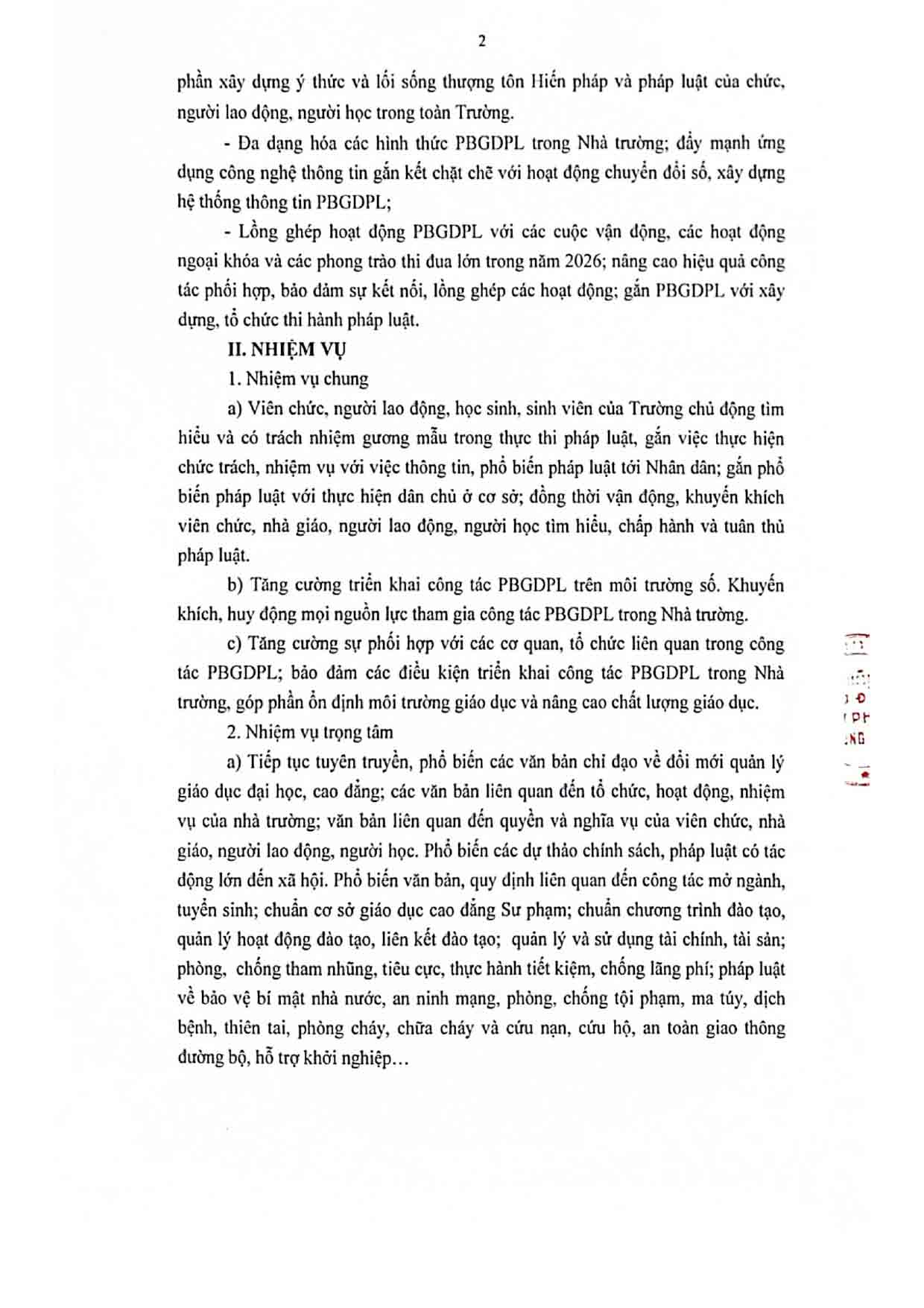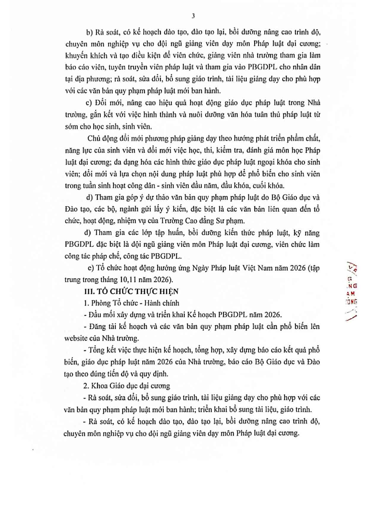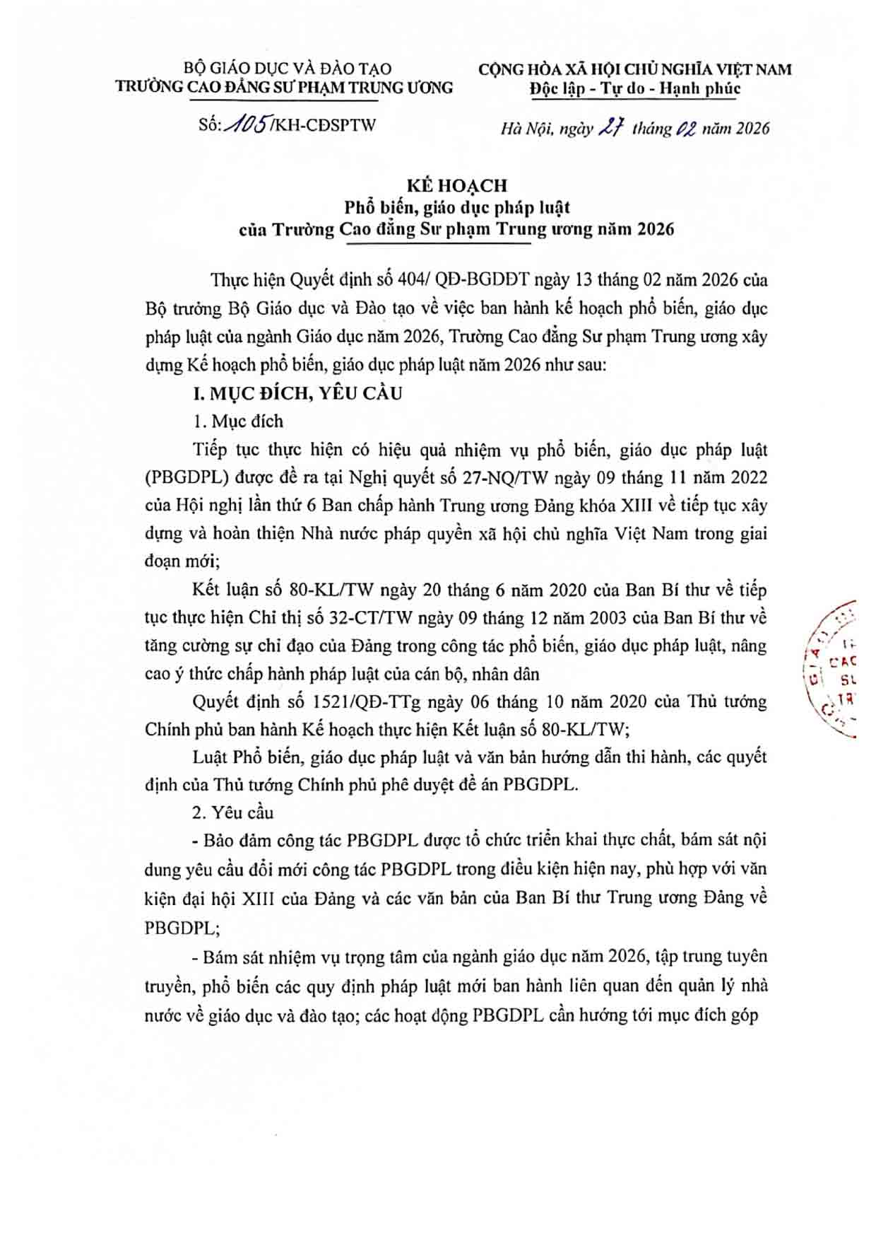 Kế hoạch Phổ biến, giáo dục pháp luật của Trường Cao đẳng Sư phạm Trung ương năm 2026