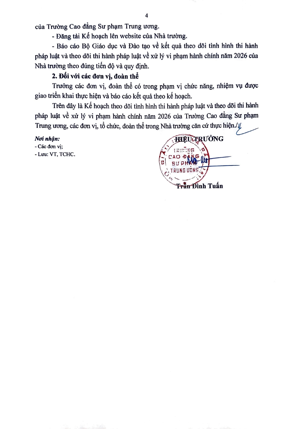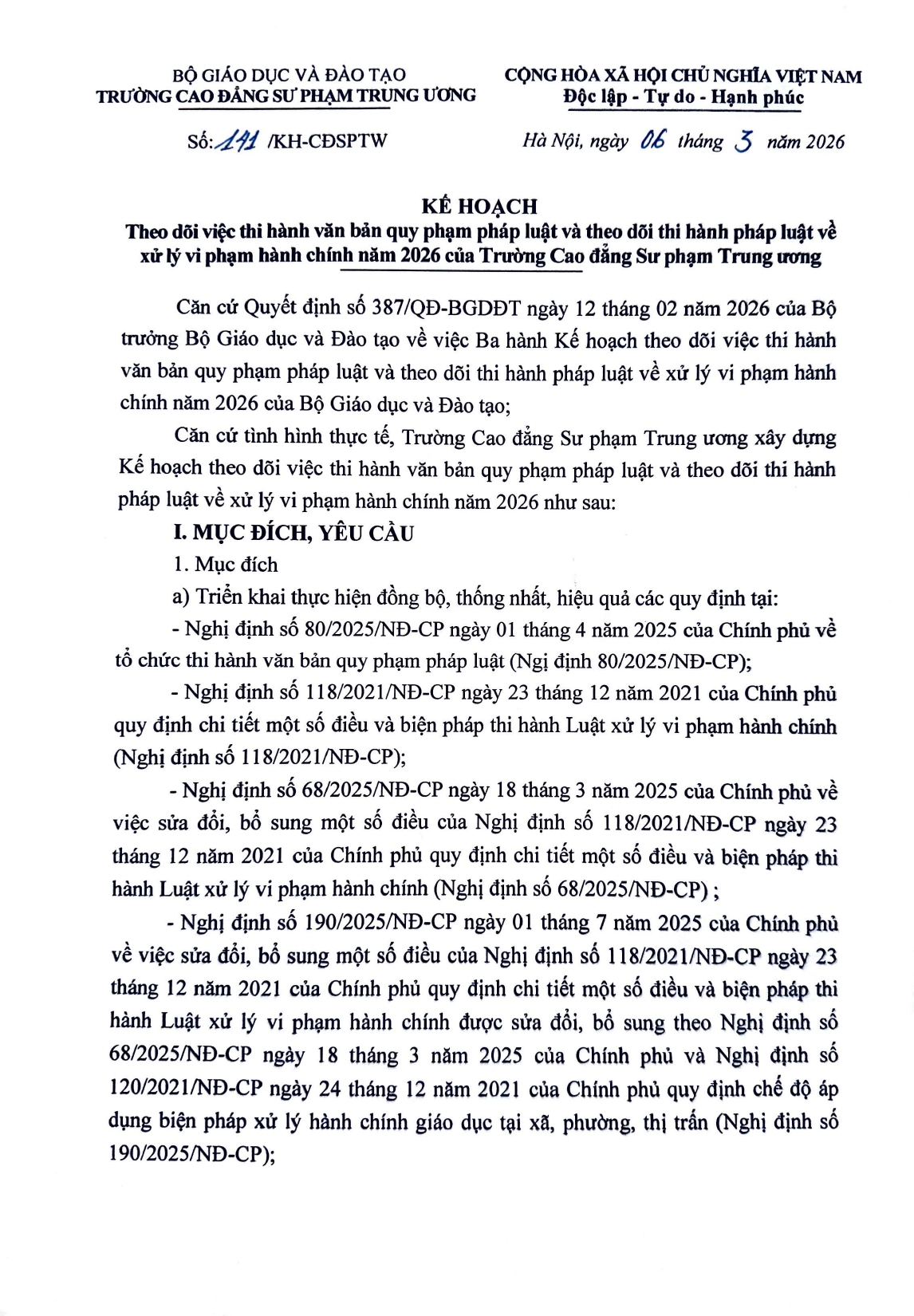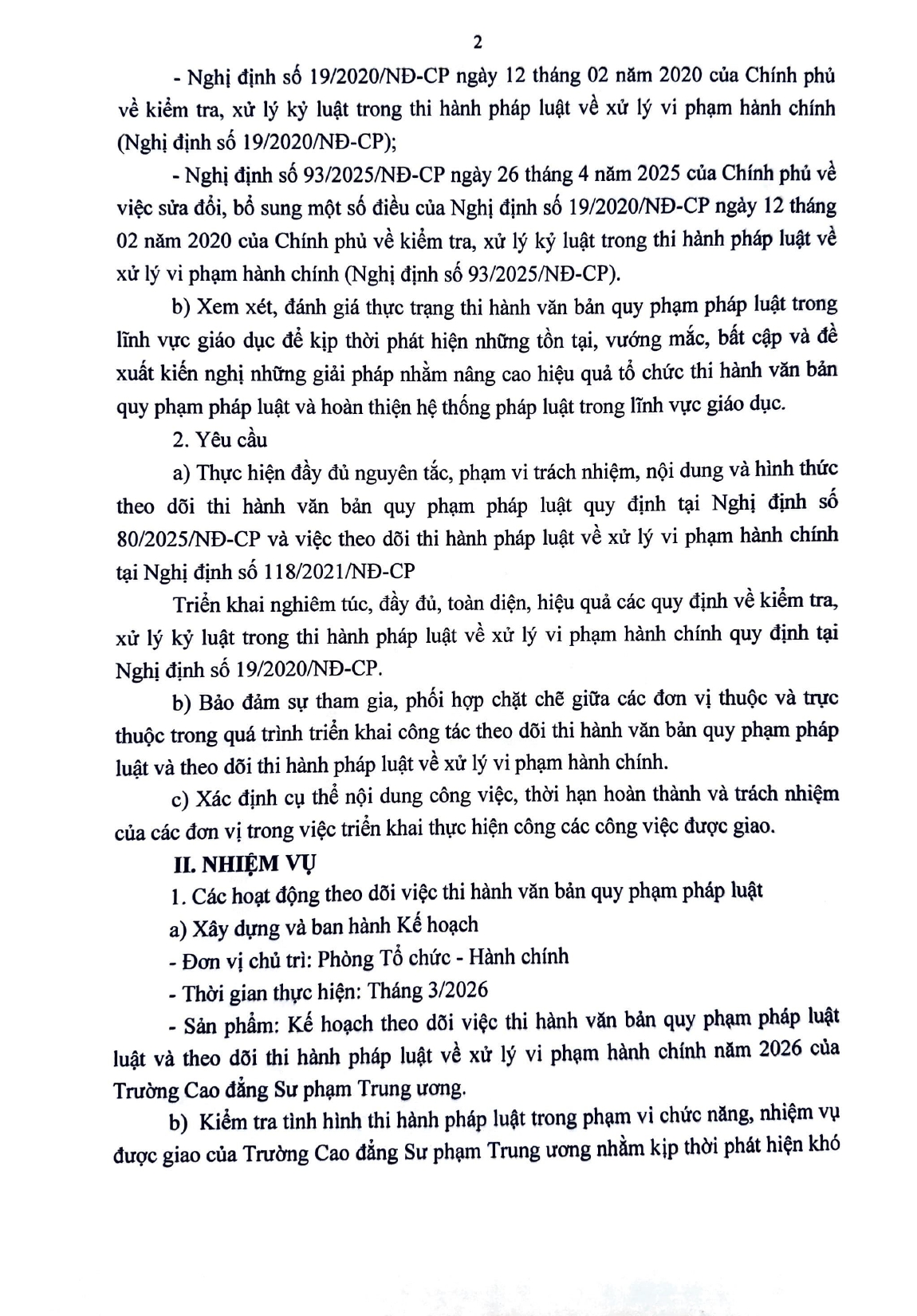 Kế hoạch Theo dõi việc thi hành văn bản quy phạm pháp luật và theo dõi thi hành pháp luật về xử lý vi phạm hành chính năm 2026 của Trường Cao đẳng Sư phạm Trung ương