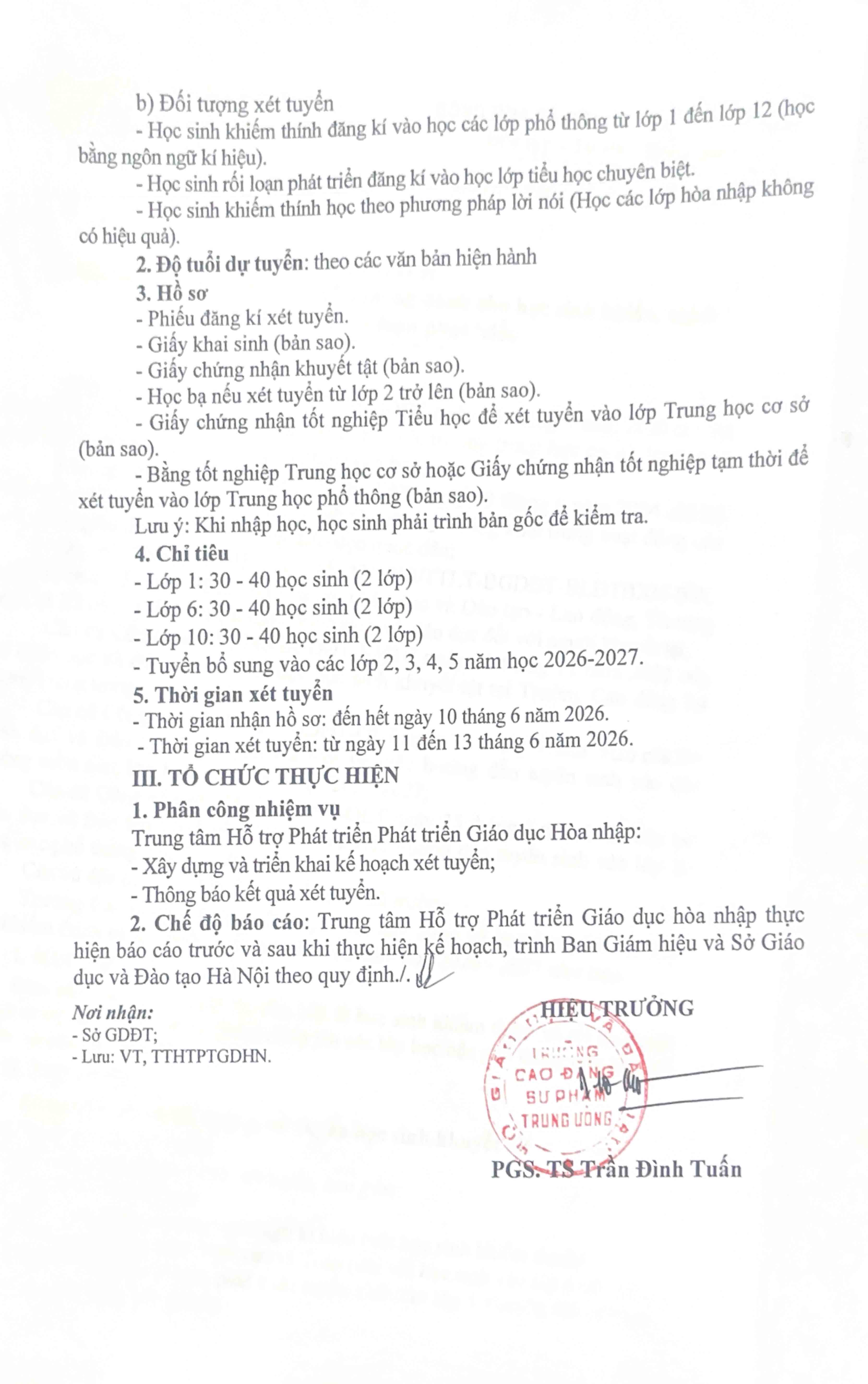 Kế hoạch Về việc xét tuyển vào các lớp phổ thông dành cho học sinh khiếm thính và học sinh rối loạn phát triển
