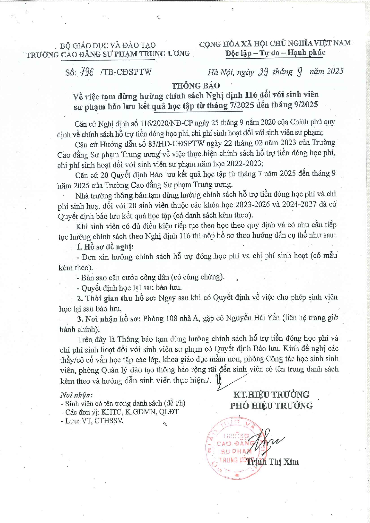 Thông báo Về việc tạm dừng hưởng chính sách Nghị định 116 đối với sinh viên sư phạm bảo lưu kết quả học tập từ tháng 7/2025 đến tháng 9/2025 (Có danh sách Danh sách tạm dừng hưởng chính sách nghị định số 116 đối với sinh viên sư phạm bảo lưu kết quả học tập từ tháng 7-2025 đến tháng 9-2025 kèm theo)